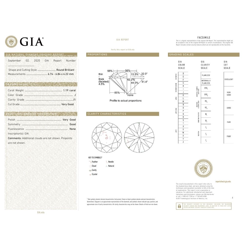 GEM: 1) 1.19ct Round Diamond J- Color I1-Clarity GIA Certified 40)Accent Diamonds .27 ctw, 23)Wedding bands .32 ctw Si1 – Si2 Clarity G-H Color