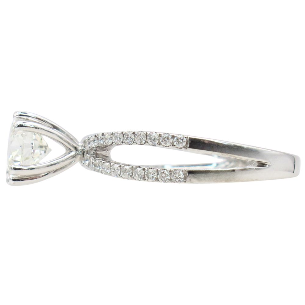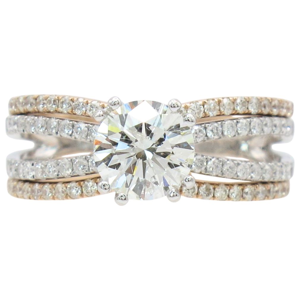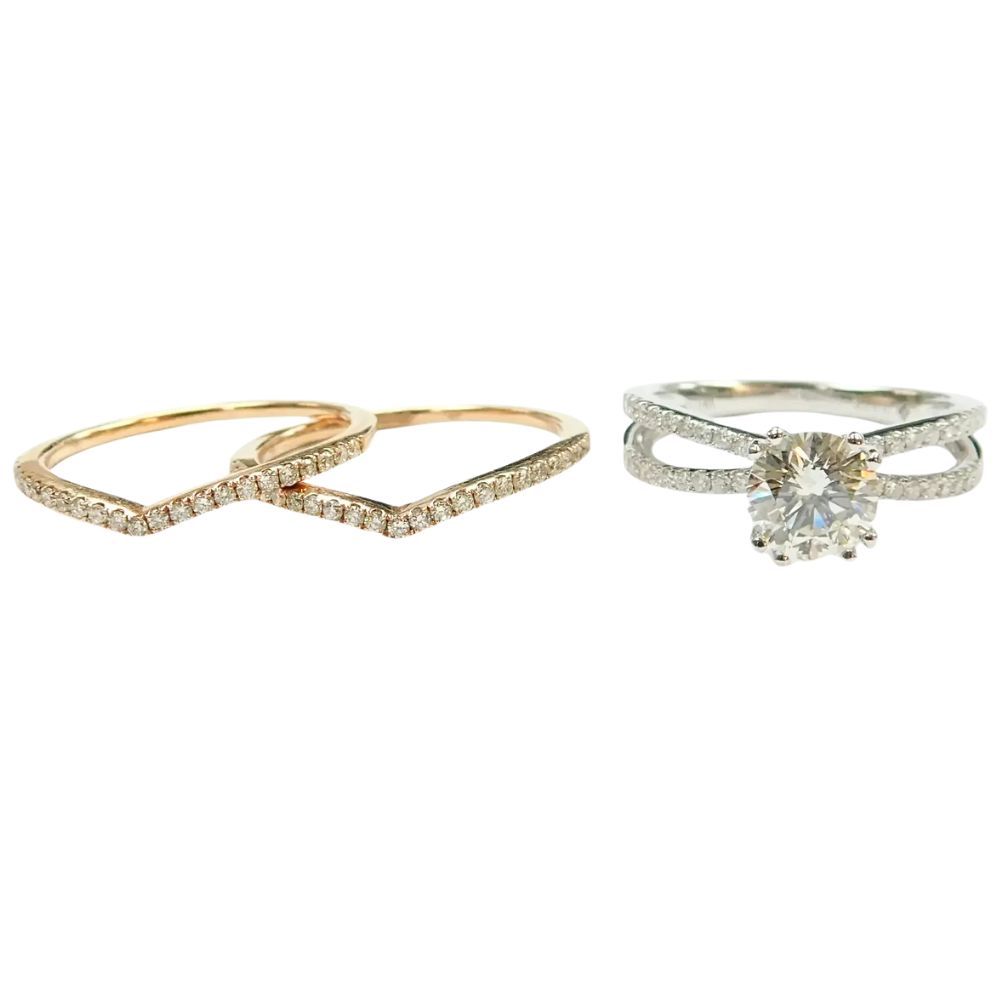 Brilliantly radiant and eternally elegant, this stunning diamond engagement ring showcases an eye-catching 1.19 carat GIA-certified center diamond, expertly cut to deliver exceptional brilliance, fire, and scintillation. The center stone is securely set in a classic double-prong head, offering enhanced security beyond a traditional four-prong setting, and rises gracefully above a refined white gold split shank adorned with sparkling diamond accents. Completing this exquisite bridal set are two perfectly contoured wedding bands in warm 14K rose gold, each pavé set with 0.16 carats of diamonds and designed to nestle seamlessly alongside the engagement ring. Timeless in design yet rich in detail, this beautifully coordinated set offers effortless elegance and enduring romance.
