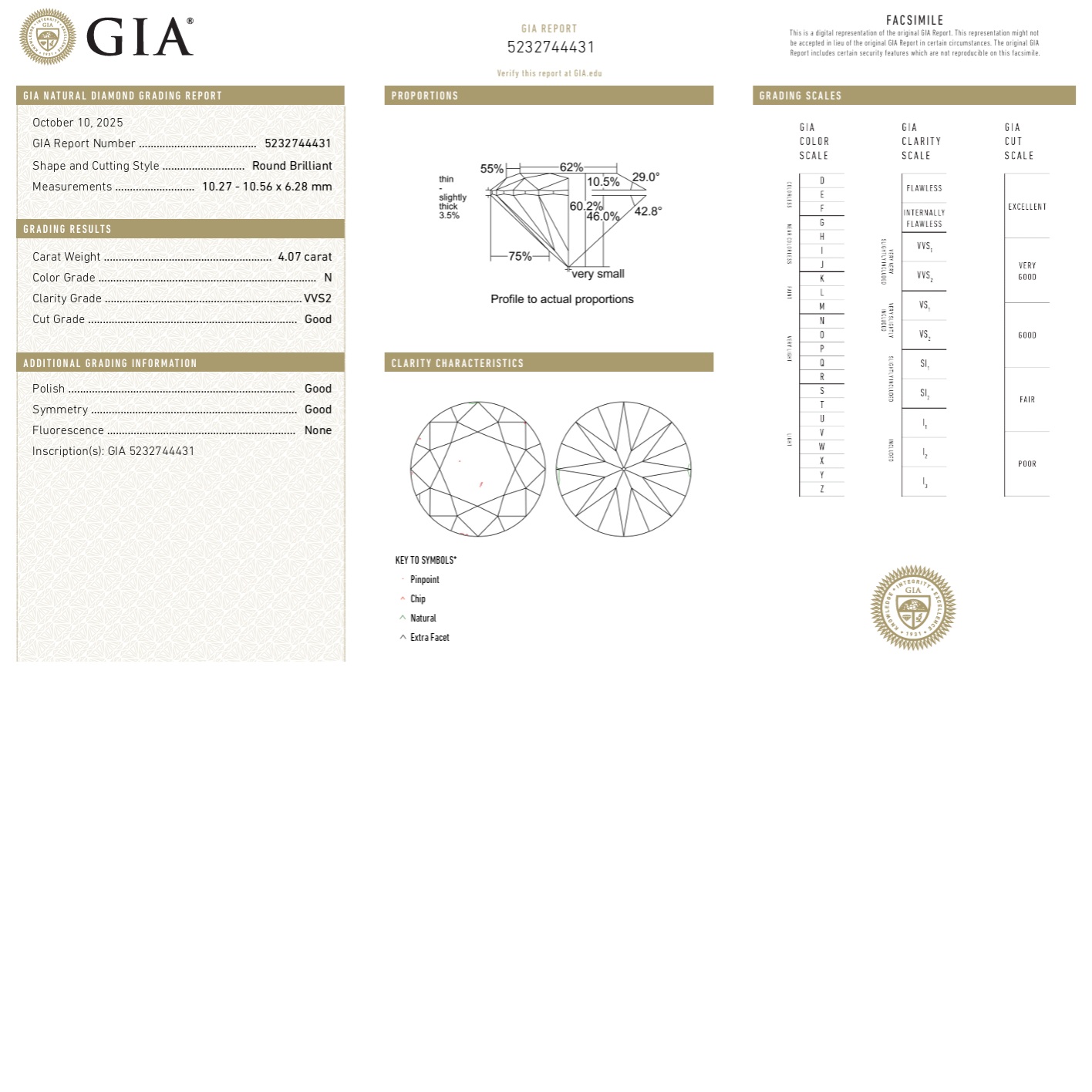 A breathtaking celebration of scale, warmth, and craftsmanship, this extraordinary statement ring is designed to captivate. At its center is a GIA-certified 4.07 carat round brilliant diamond, boasting an exceptional VVS2 clarity that delivers remarkable transparency and light performance. It’s N color reveals a rich, candlelight-warm yellow hue—romantic, luminous, and unmistakably sophisticated. The diamond’s brilliance is beautifully balanced by its warmth, creating a glow that feels both timeless and distinctive. The center stone is secured in a substantial, luxury statement setting that exudes confidence and presence. Enhancing the band are six round brilliant accent diamonds, each bezel-set for a sleek, modern look while offering added security and elegance. These accents are meticulously matched at VS2 clarity and G color, providing crisp contrast and exceptional sparkle, with a total accent weight of 0.97 carats. With over 5 carats of diamonds in total, this ring is unapologetically bold—crafted for those who appreciate refined luxury, rare beauty, and commanding design. Whether worn as an engagement ring or a signature statement piece, this creation is designed to impress, enchant, and leave a lasting impression on anyone who sees it.