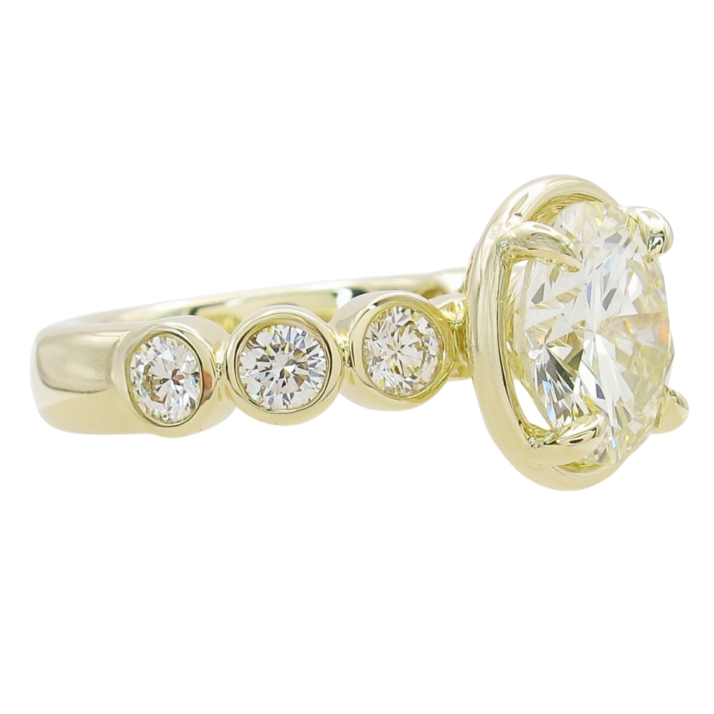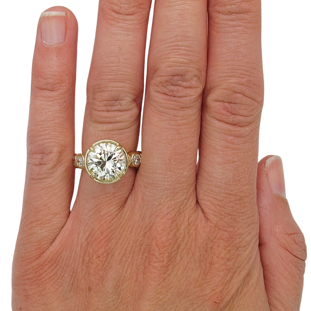 GEM: (1) 4.07ct Round Brilliant Diamond GIA certified VVS2 clarity N (yellow) color with (6) Round Brilliant VS1 clarity G color accents diamonds totaling 0.97 carats