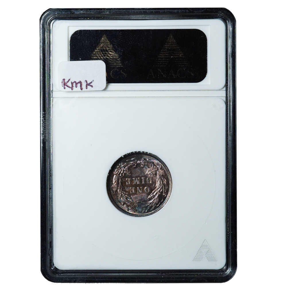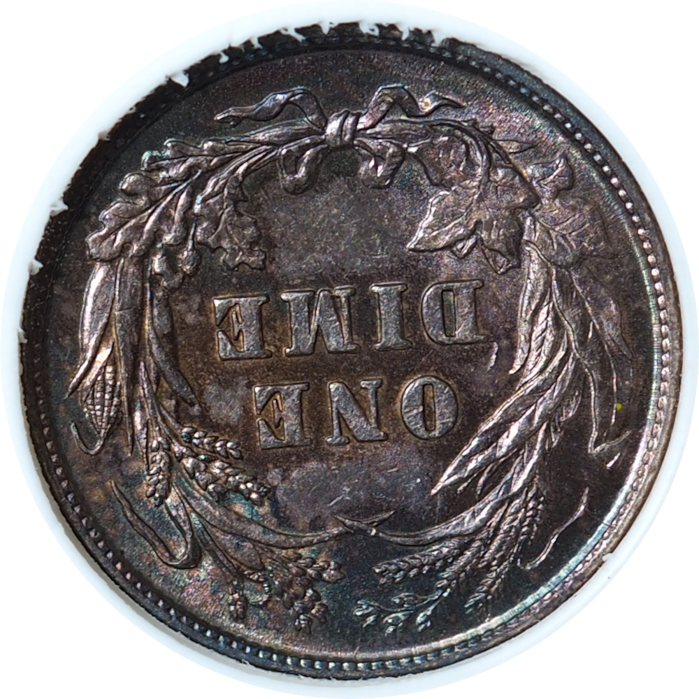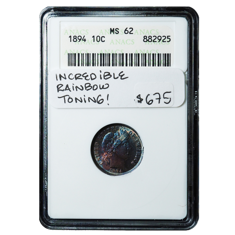 This spectacular 1894 Barber Dime, graded MS62 by ANACS, is housed in a highly collectible vintage ANACS “Soapbox” holder and showcases incredible natural rainbow toning. Coins with this level of vibrant, multi-color toning are increasingly rare and highly sought after, especially when preserved in an early-generation holder.