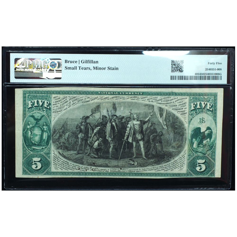 This attractive 1875 $5 National Bank Note, graded PMG 45, was issued by a national bank in Dunkirk, New York, under Charter #2619. Notes from the 1875 series represent some of the earliest large-size National Bank Notes, making them especially desirable to collectors of early U.S. paper money.