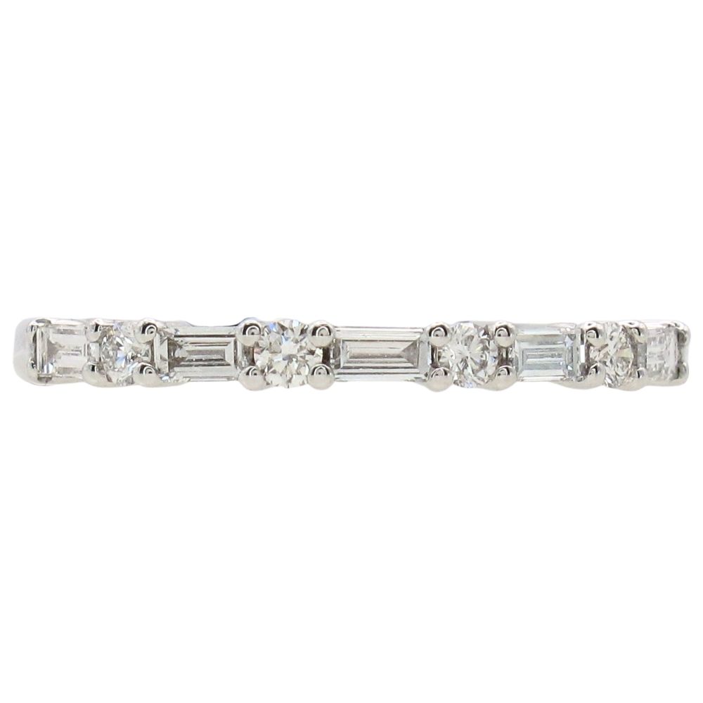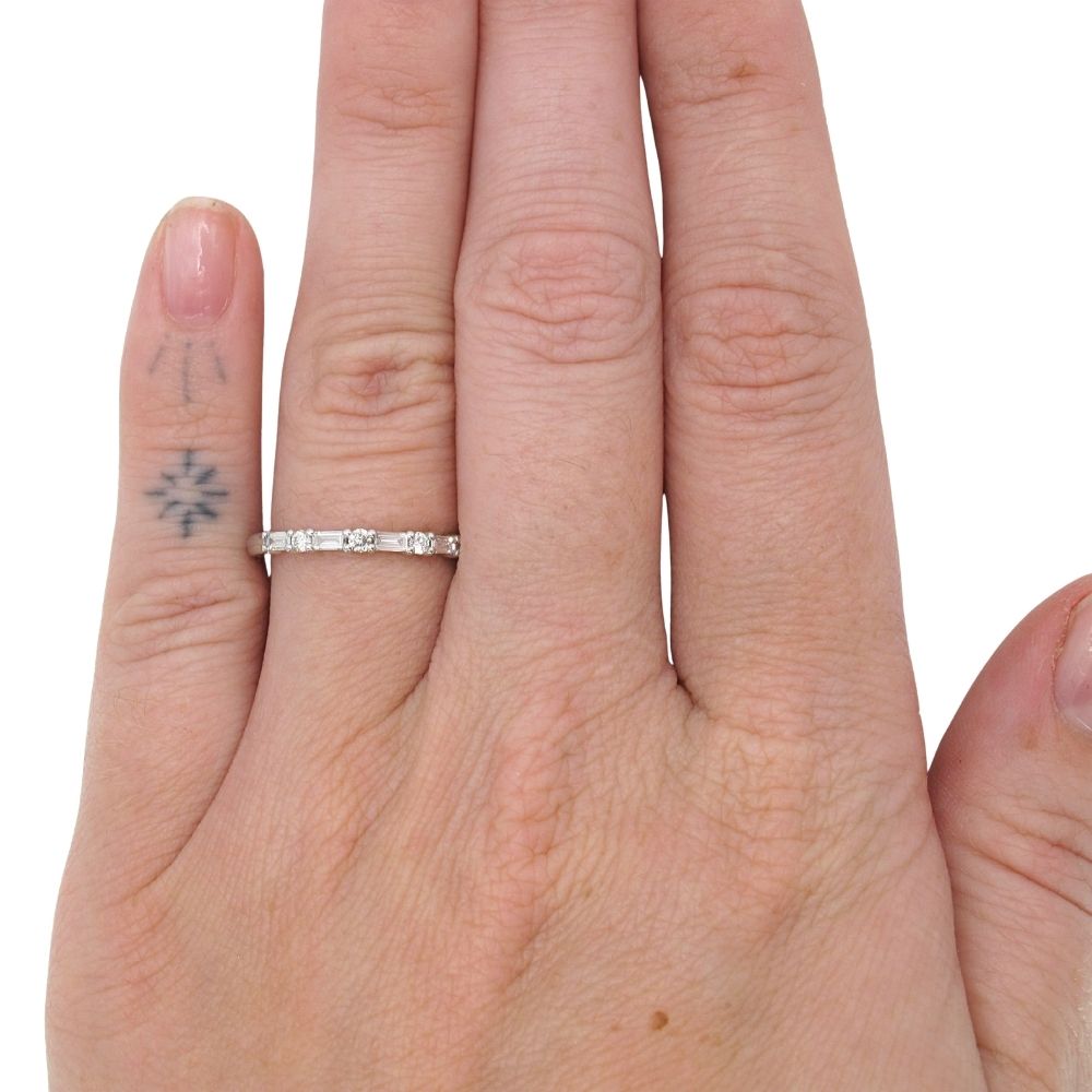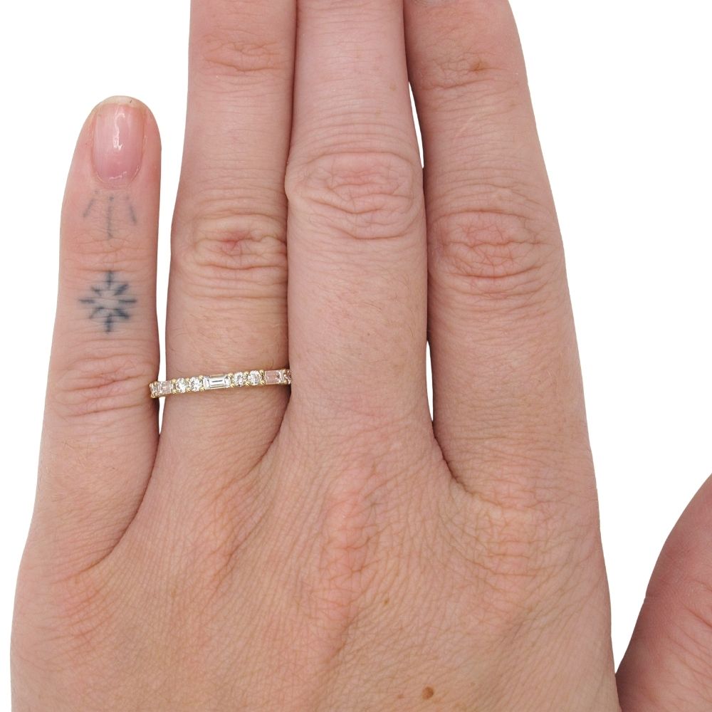 Striking in its simplicity yet rich in refined detail, this 14K gold diamond wedding band, available in yellow gold or white gold, reimagines a classic silhouette with a modern, streamlined edge. The design features an elegant alternating pattern of elongated baguette diamonds paired with a single round brilliant diamond between each, allowing each stone to shine with maximum light exposure. This open, airy arrangement enhances the natural brilliance and clean geometry of the diamonds. Perfect for stacking or making a quiet statement on its own, this wedding band is an ideal choice for those seeking timeless sophistication with a contemporary twist.