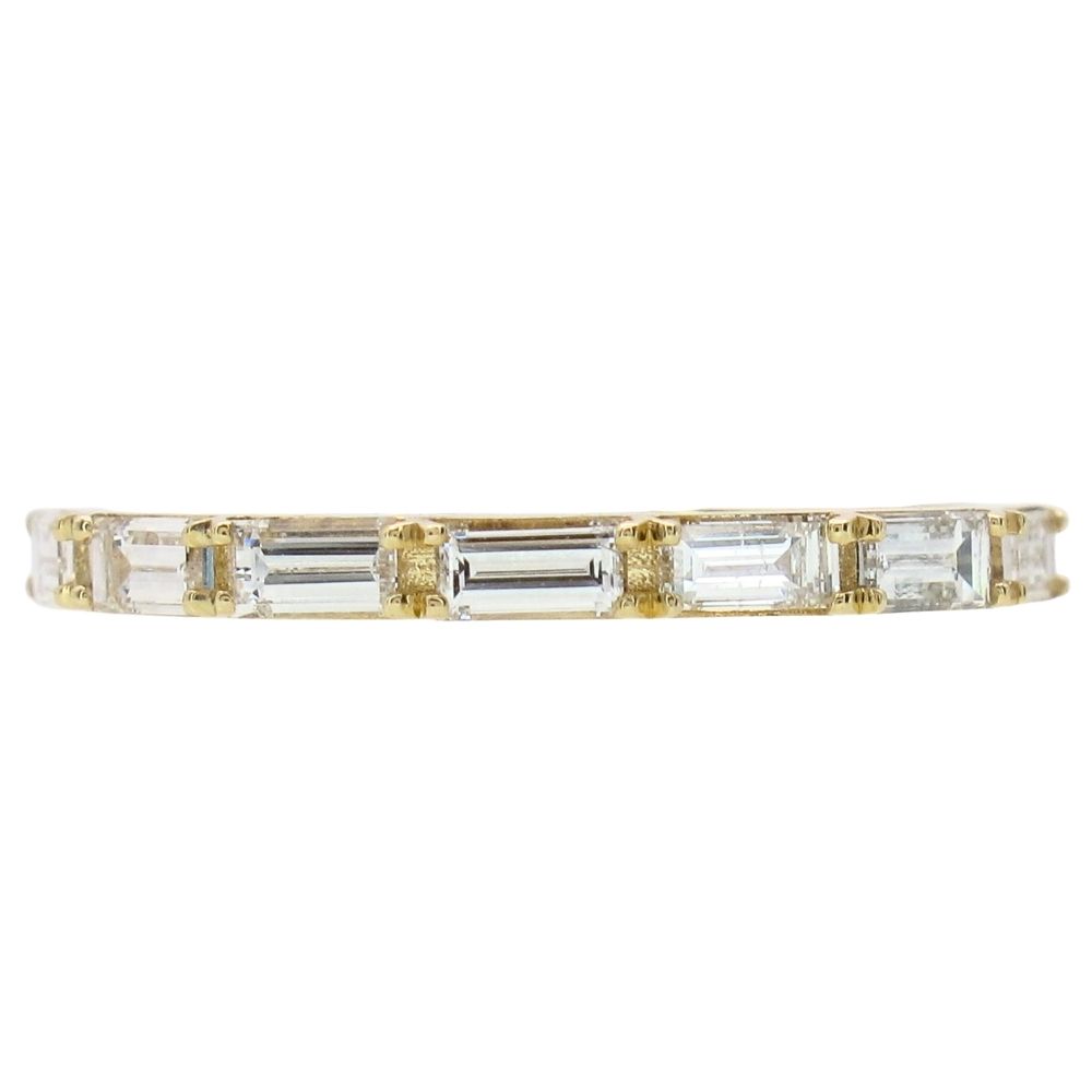 Refined and effortlessly sophisticated, this elegant wedding band is crafted in your choice of 14K yellow gold or 14K white gold, offering a timeless foundation for any fine jewelry collection. Showcasing just over half a carat of sleek baguette-cut diamonds, each stone is meticulously selected for its premium G-color and VS clarity, delivering a clean, modern brilliance with a distinctive linear sparkle. The diamonds are set halfway along the band, creating a balanced half eternity design that maximizes visual impact while ensuring everyday comfort and wearability. Designed with versatility in mind, this stackable diamond band pairs seamlessly with engagement rings or other stacking rings, allowing for a personalized, layered look. Its resizable construction ensures a perfect fit without compromising craftsmanship, making it an ideal choice for a wedding band, anniversary ring, or minimalist diamond statement piece. Combining contemporary design with classic luxury, this 14K gold baguette diamond band offers exceptional quality, enduring style, and refined brilliance for the modern bride.