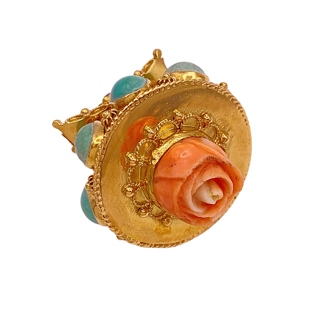 Vintage charm crafted in opulent 18K yellow gold featuring an intriguing design displaying colorful gemstones including cabochons of Turquoise and Garnet with angel skin Coral carved into a rose detail. It is highlighted with hand applied cannetille filigree embellishments. Often worn as a bracelet charm but can easily be used as a pendant as well.