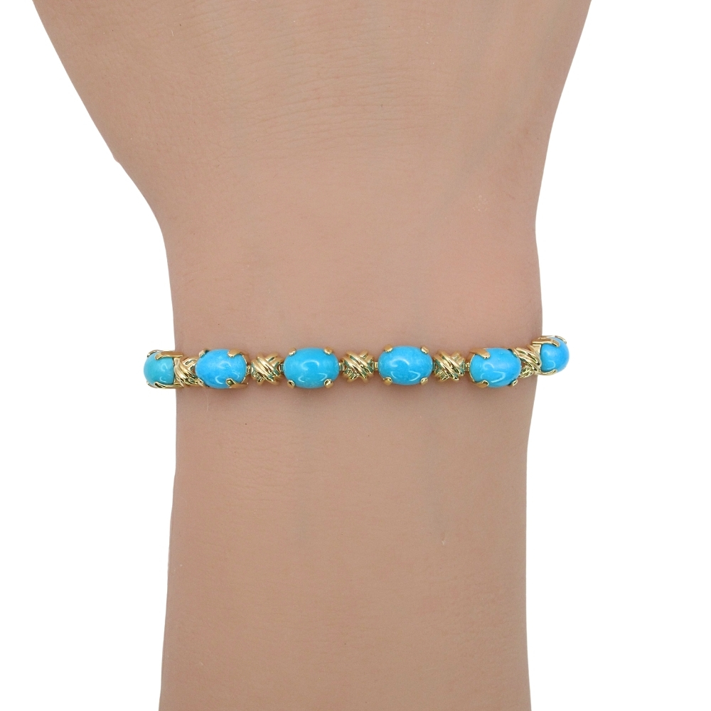 This elegant oval cabochon turquoise line bracelet is a timeless classic, showcasing a row of well-matched, beautifully polished turquoise gemstones. Each vibrant stone is accented by small gold “X” style links, adding both texture and sophistication to the design. Crafted for both beauty and durability, the bracelet is secured with a sturdy box clasp and safety lock for peace of mind. A striking blend of bold color and refined craftsmanship, this bracelet is perfect for turquoise lovers and makes a versatile addition to any fine jewelry collection.