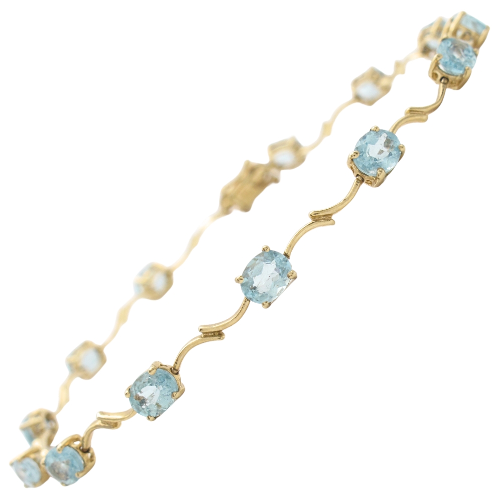 This vintage bracelet, crafted in warm 10K yellow gold, showcases thirteen oval faceted natural Aquamarine gemstones totaling 4.16 carats, each radiating the serene blue tones that make Aquamarine so timeless and beloved. The stones are elegantly separated by asymmetrical wave-shaped gold bars, creating a flowing, modernist look that enhances the bracelet’s graceful movement on the wrist. Finished with a decorative box clasp and double gate safety locks for secure everyday wear, this piece combines vintage charm with refined sophistication—perfect for collectors and high-end jewelry lovers seeking a unique Aquamarine statement.