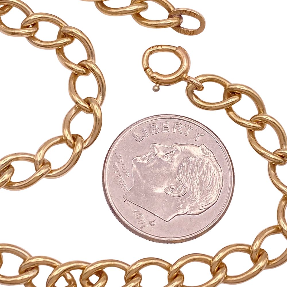 Add a touch of timeless elegance to your collection with this vintage bracelet, circa 1930–1940s, beautifully crafted in 14K yellow gold. Featuring classic cable links and measuring 7 inches in length, this charming piece exudes vintage sophistication and versatility. Secured with a spring ring clasp, it was originally designed as a charm bracelet, offering the perfect foundation for displaying cherished charms or wearing alone for a refined, understated look. A true vintage gold treasure, it showcases the enduring craftsmanship and style of a bygone era.