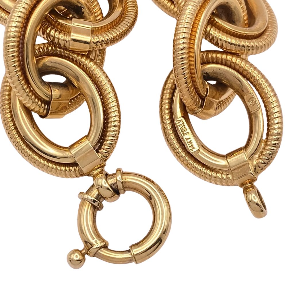 Make a bold style statement with this vintage chunky 14K yellow gold bracelet, designed with substantial oval links that showcase a striking contrast of polished and textured finishes. Secured with a decorative spring ring clasp, this estate bracelet captures both timeless sophistication and effortless versatility, making it a standout accessory for any occasion. Pictured as received from a local estate, it can be professionally cleaned or polished at no additional cost—simply leave a note at checkout. A true collector’s piece, this vintage gold statement bracelet is the perfect blend of elegance and bold design.
