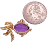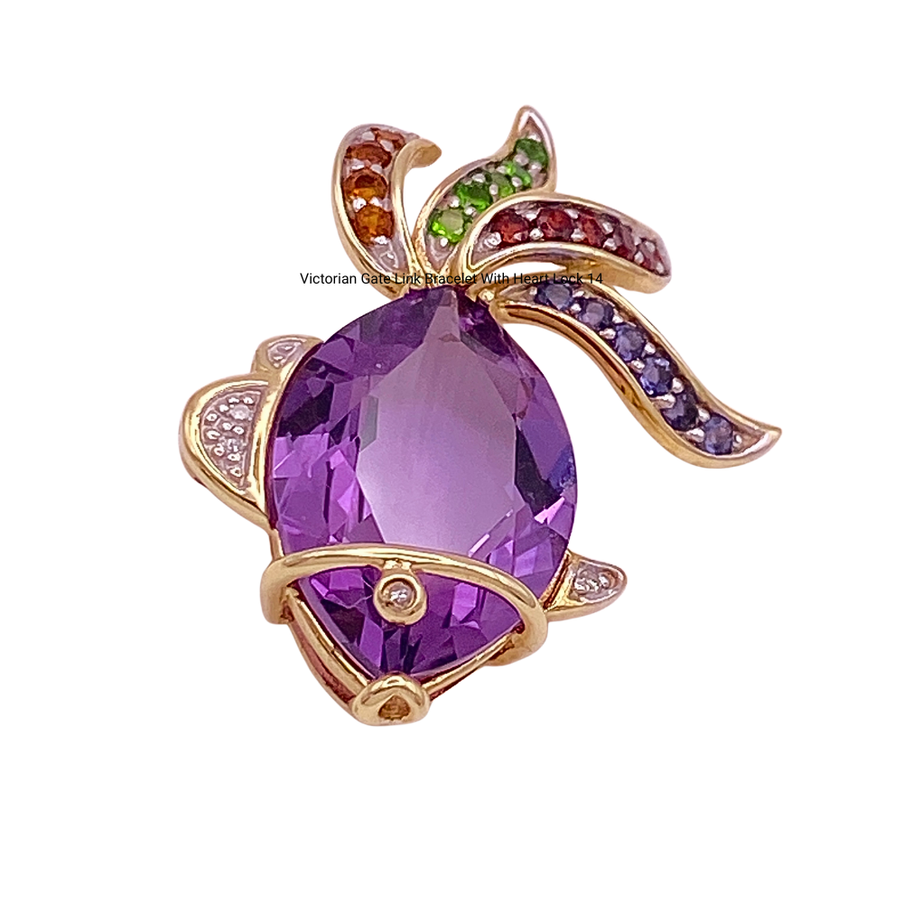 Estate fish pendant crafted in fine 14K yellow gold featuring a fat marquis cut Amethyst body accented by an assortment or round cut gemstones including Diamond, Sapphire, Garnet, Tsavorite, and Citrine.