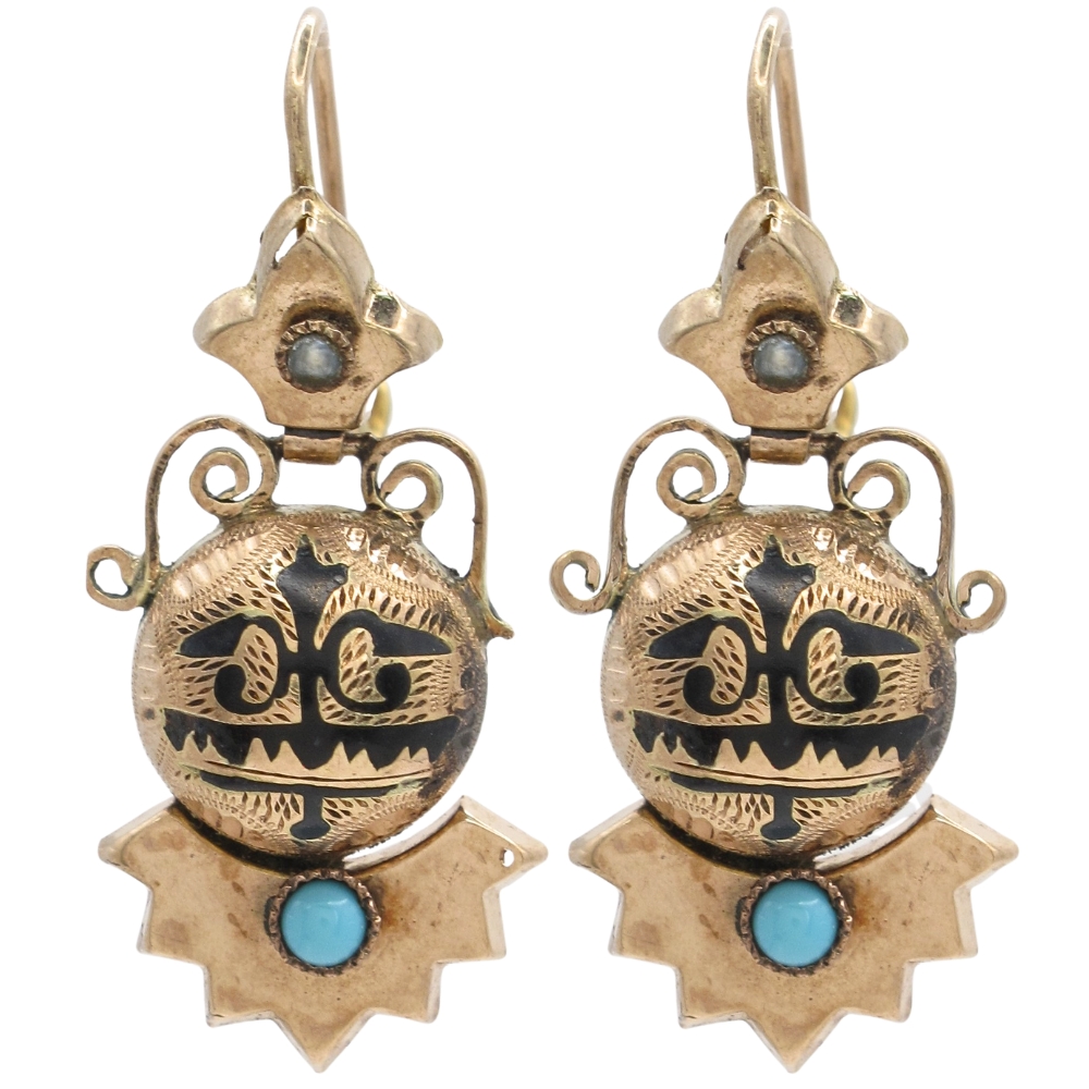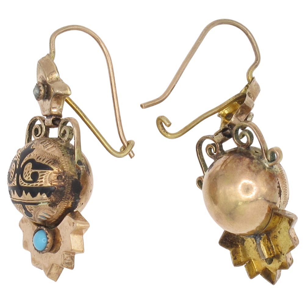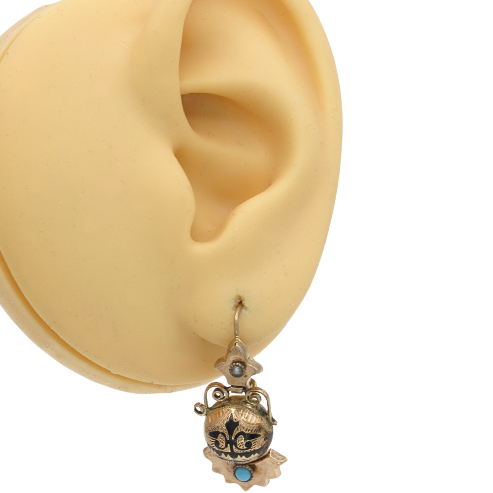 These exquisite Victorian era dangle earrings are crafted in warm 10K rose gold and showcase a striking central spherical element adorned with decorative Taille d’Epargne black enamel. Accented with vivid turquoise and delicate seed pearl gemstones, the design reflects the refined craftsmanship and rich symbolism of 19th-century jewelry. The earrings offer beautiful movement and are designed for pierced ears with classic shepherd hook wires and secure locking catches. Romantic and timeless, these antique earrings are a rare find, perfect for collectors and admirers of authentic Victorian jewelry with elegant detail and historical charm.