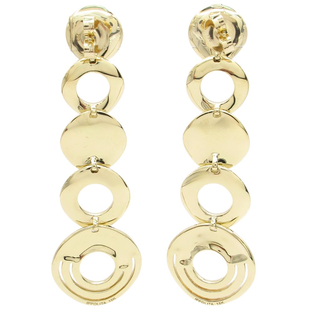 These striking designer Ippolita earrings are a true statement piece, crafted in luxurious 18K yellow gold and showcasing five graduated discs that elegantly increase in size as they descend. The top disc features Ippolita’s signature “flower” motif, fully encrusted in sparkling pavé diamonds and designed to detach for wear as a standalone stud—offering two distinct looks in one exquisite pair. Below, alternating open-circle and polished gold discs create a dynamic, sculptural silhouette that reflects light with every movement. As seen in the photo, the diamonds continue throughout the design, accenting each open disc with radiant brilliance. Bold yet refined, these estate earrings exemplify Ippolita’s celebrated artistry and make the perfect luxury accessory for collectors and high-end jewelry enthusiasts seeking an unforgettable, fashion-forward piece.