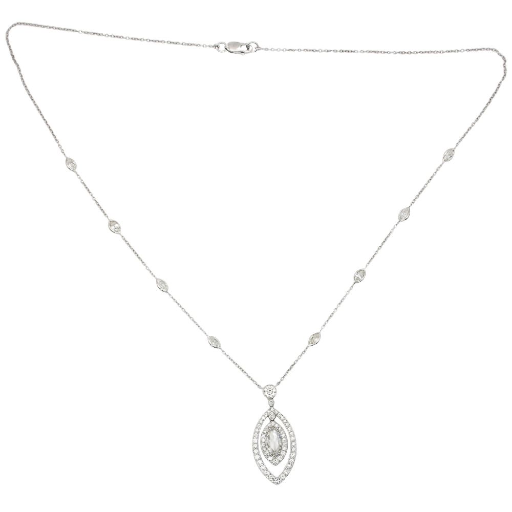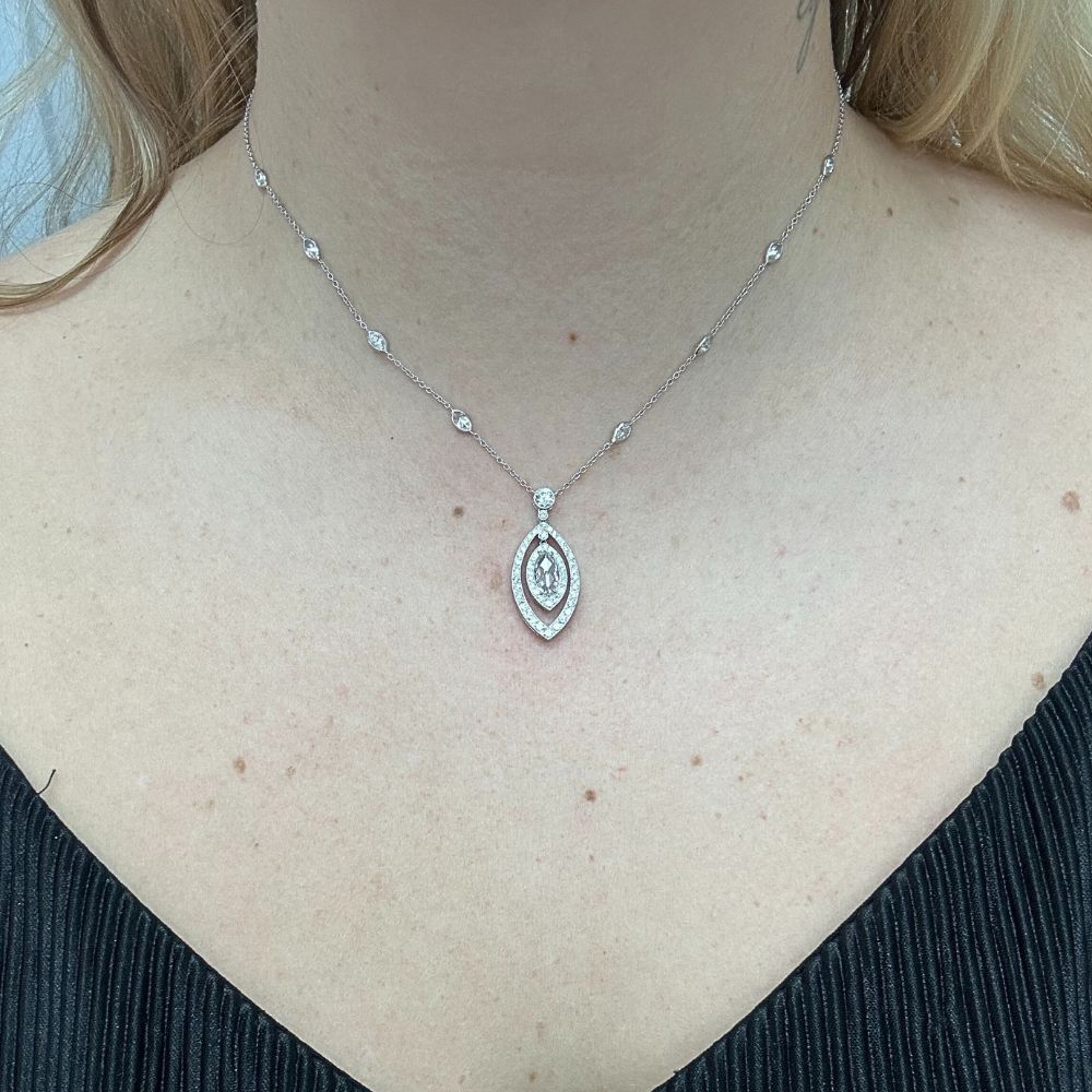 Graceful and endlessly refined, this beautiful estate necklace is crafted in 14K white gold and features a striking marquise rose-cut diamond suspended within two delicately graduating diamond halos, with the center diamond element designed to be mobile, allowing it to move fluidly within the outer halo for captivating brilliance and movement. The elegant drop is further enhanced by marquise-shaped diamonds bezel set along the chain, creating a continuous line of sparkle that draws the eye. Timeless in design and sophisticated in execution, this necklace is a captivating statement of classic elegance, perfect for both formal occasions and elevated everyday wear.