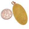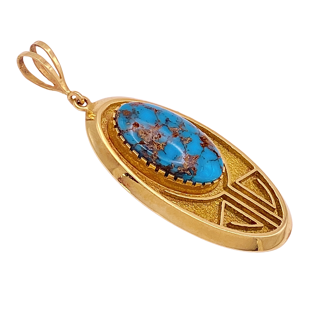 Big vintage pendant handcrafted by Navajo silversmith Al Nez. This impressive shadowbox pendant is made of 14K yellow gold and displays an oval polished Turquoise cabochon gemstone in a notched edge bezel. The attached bale will accommodate a chain up to 5.5 mm.
