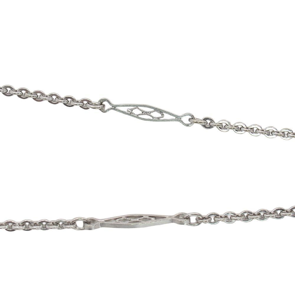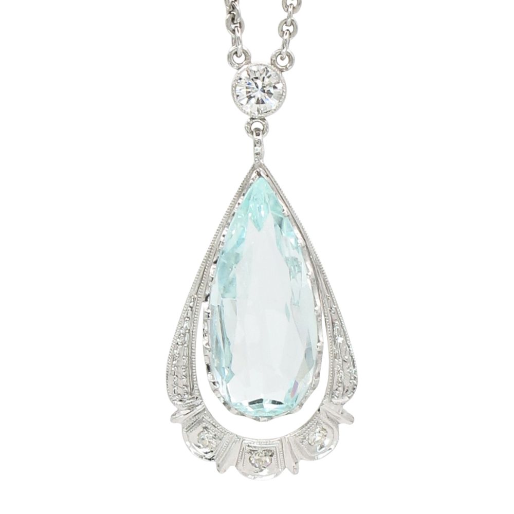 Ethereal and exquisitely detailed, this vintage Art Deco necklace features a captivating aquamarine with a delicate pale blue hue reminiscent of a clear summer sky, framed by a tapered border with hand-engraved detailing and three single-cut round accent diamonds set along a graceful scalloped edge. At the top of the pendant, a bezel-set 0.25 carat round brilliant diamond adds a striking point of brilliance, drawing the eye and enhancing the pendant’s elegant geometry. The pendant is suspended from a playful cable and rhombus link stationary necklace measuring 25 inches in length, with an additional 1 1/8-inch drop that creates a dramatic, elongated silhouette. A true statement piece, this necklace pairs beautifully with evening wear while effortlessly adding feminine flair and vintage charm to a more understated look.