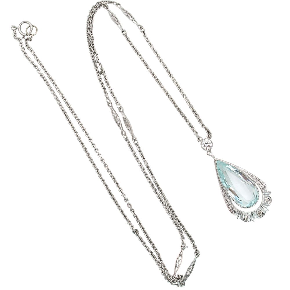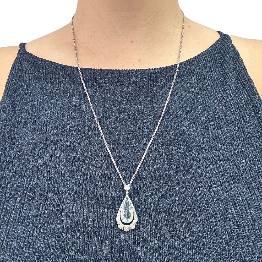 5.69ct Pear Cut Aquamarine Art Deco Necklace 14k White Gold