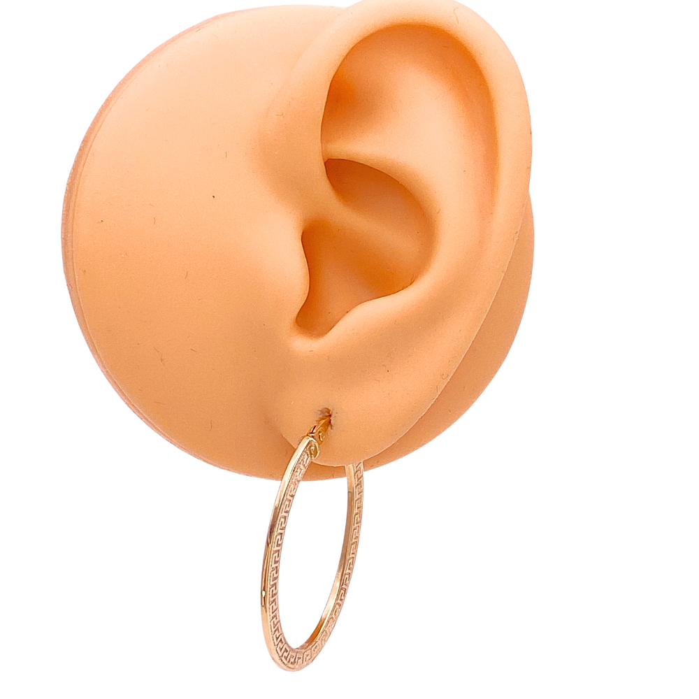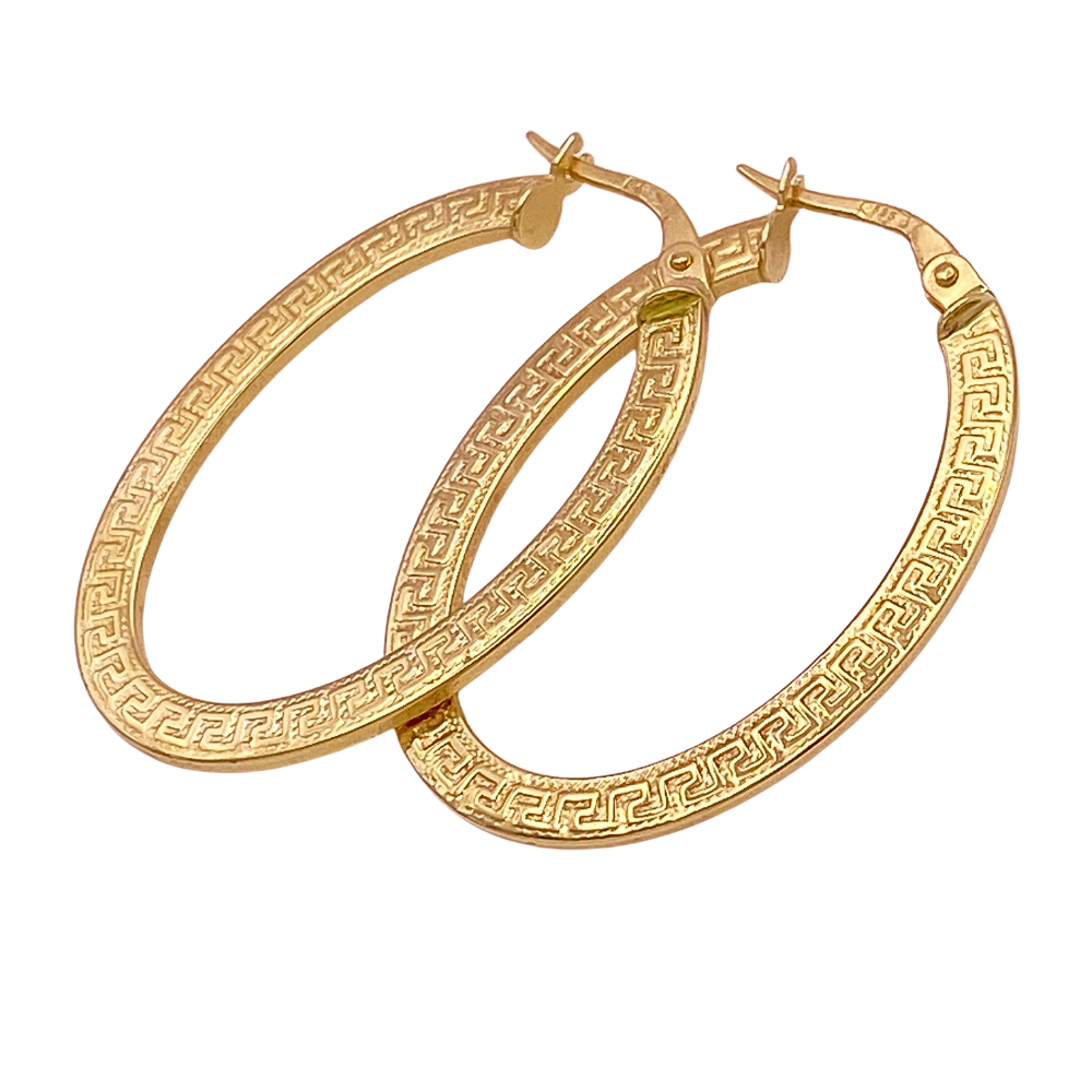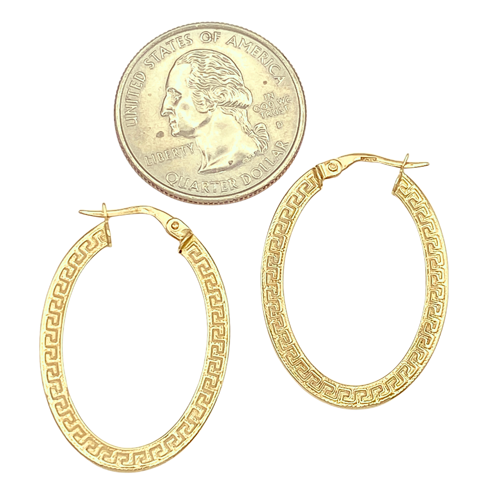 Oval Hoop Earrings 14K Gold Greek Key Detail