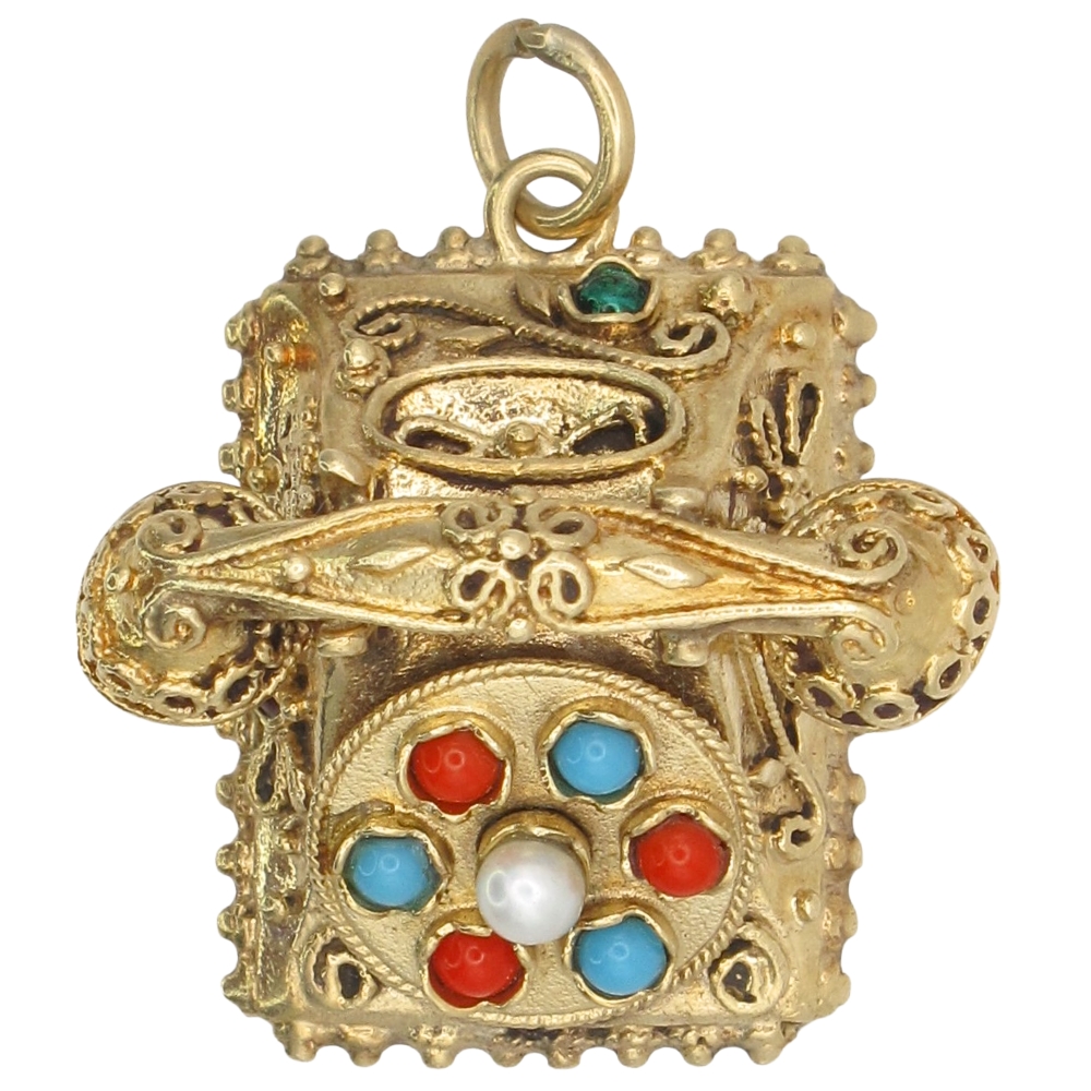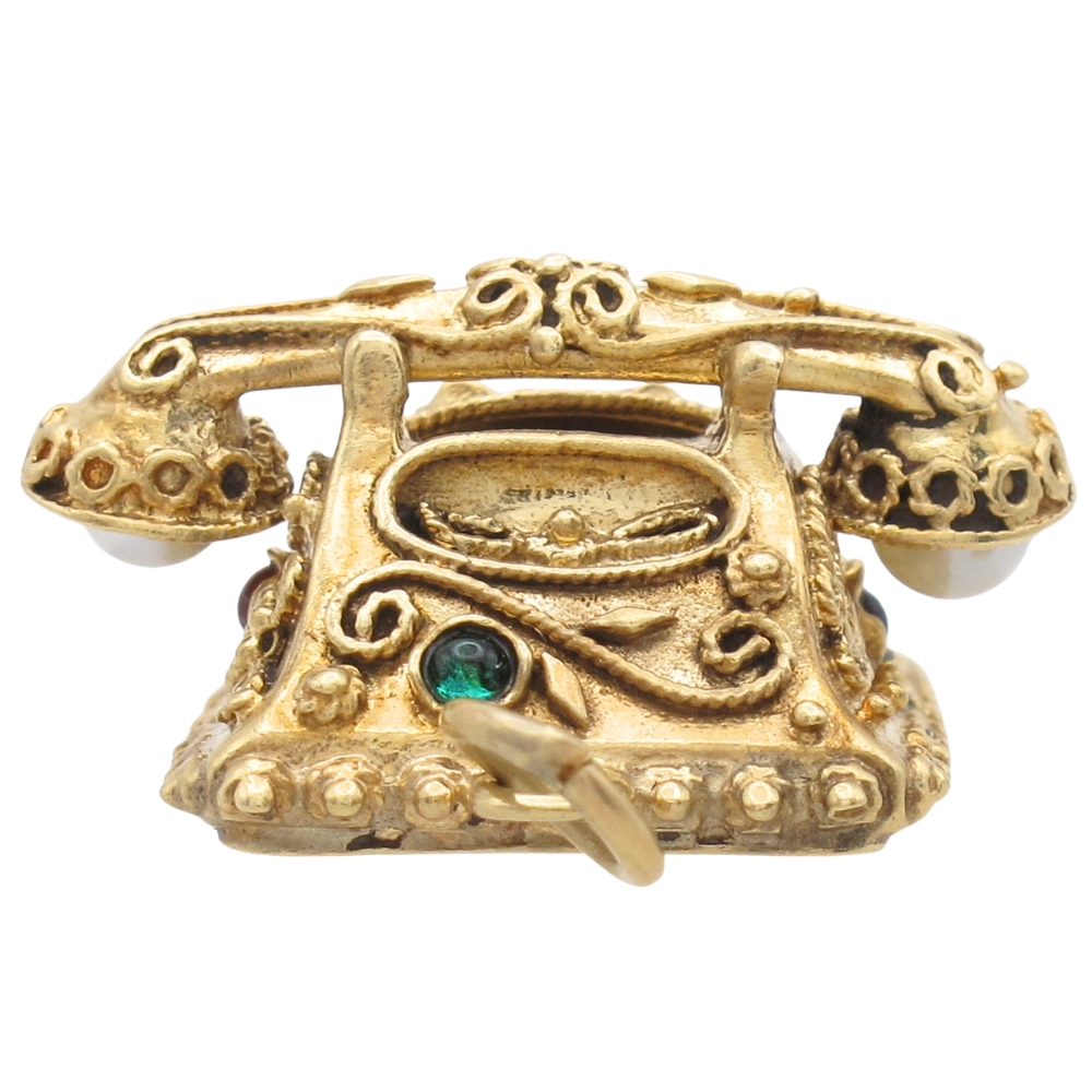 This impressive vintage jeweled charm is a standout collectible, handcrafted in fine 14K yellow gold and designed as a fully dimensional rotary telephone with a delightful moving dial. Richly detailed with colorful gemstones and ornate cannetille filigree work, it captures the charm of classic craftsmanship while offering vibrant visual appeal. The piece includes an attached unsoldered jump ring, making it effortless to add to your charm bracelet or wear as a unique pendant. Bold, whimsical, and beautifully made, this large vintage charm is perfect for high-end jewelry lovers who appreciate intricate design and one-of-a-kind treasures.