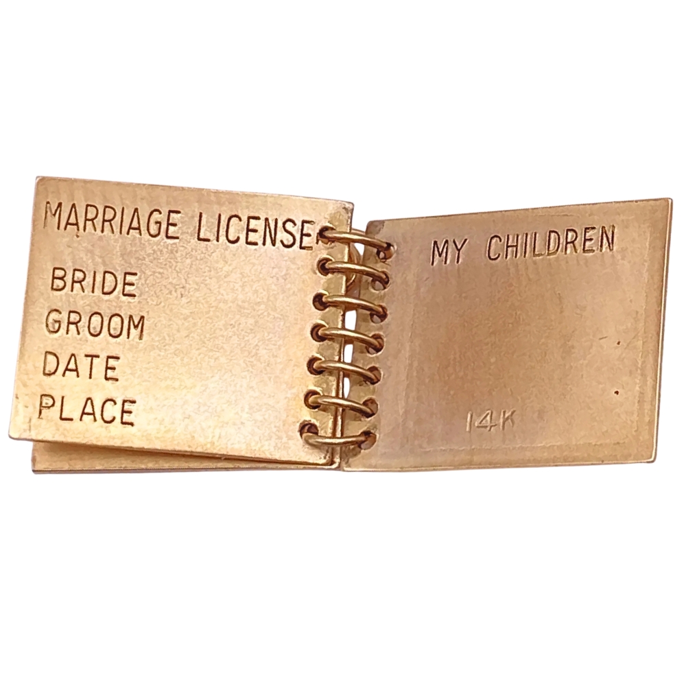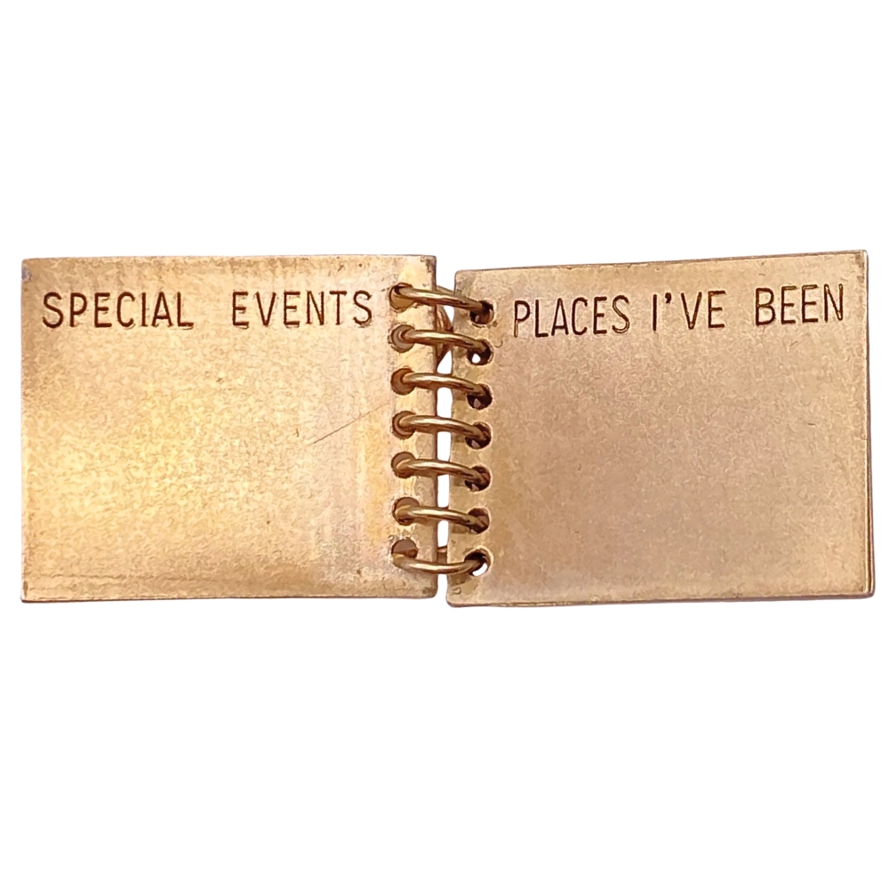 This rare vintage moving charm is beautifully crafted in fine 14K yellow gold and designed as an enchanting miniature scrapbook with engravable turning pages. Each page offers space to commemorate life’s most meaningful moments—marriage, children, special events, and more—making it a timeless keepsake of love and memory. Remarkably, this collectible piece remains free of personalization, offering a pristine canvas for your own story. Complete with an attached bale for easy addition to your bracelet or to wear as a pendant, this charming and intricate design is a true treasure for vintage jewelry lovers and sentimental collectors alike.
