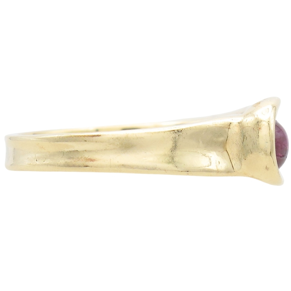 This vintage band ring is crafted in fine 14K yellow gold and features a sleek modernist design centered by a natural cabochon-cut ruby measuring 0.40 carat. The smooth, softly glowing ruby adds a refined pop of rich red color, beautifully contrasted by the warm tone of the polished gold band. Clean lines and a minimalist profile give this ring a timeless yet contemporary feel, making it ideal for everyday wear or as a unique stacking piece. Elegant and understated, this vintage ruby band ring is perfect for collectors and jewelry lovers seeking a distinctive gold ring with classic gemstone appeal and enduring style.