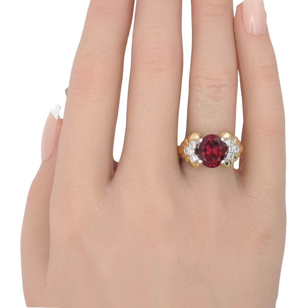 This stunning vintage ring is crafted in fine 14K yellow and white gold and features a vibrant oval faceted natural rubellite tourmaline weighing 3.10 carats, prized for its rich pinkish-red hue and eye-catching brilliance. The center stone is beautifully accented by six round brilliant diamonds in sleek bezel settings, adding balanced sparkle while enhancing the ring’s refined, timeless design. With a total gem weight of 3.28 carats, this elegant vintage rubellite and diamond ring offers a striking blend of color, craftsmanship, and classic appeal, making it a standout piece for collectors and those seeking distinctive fine estate jewelry.