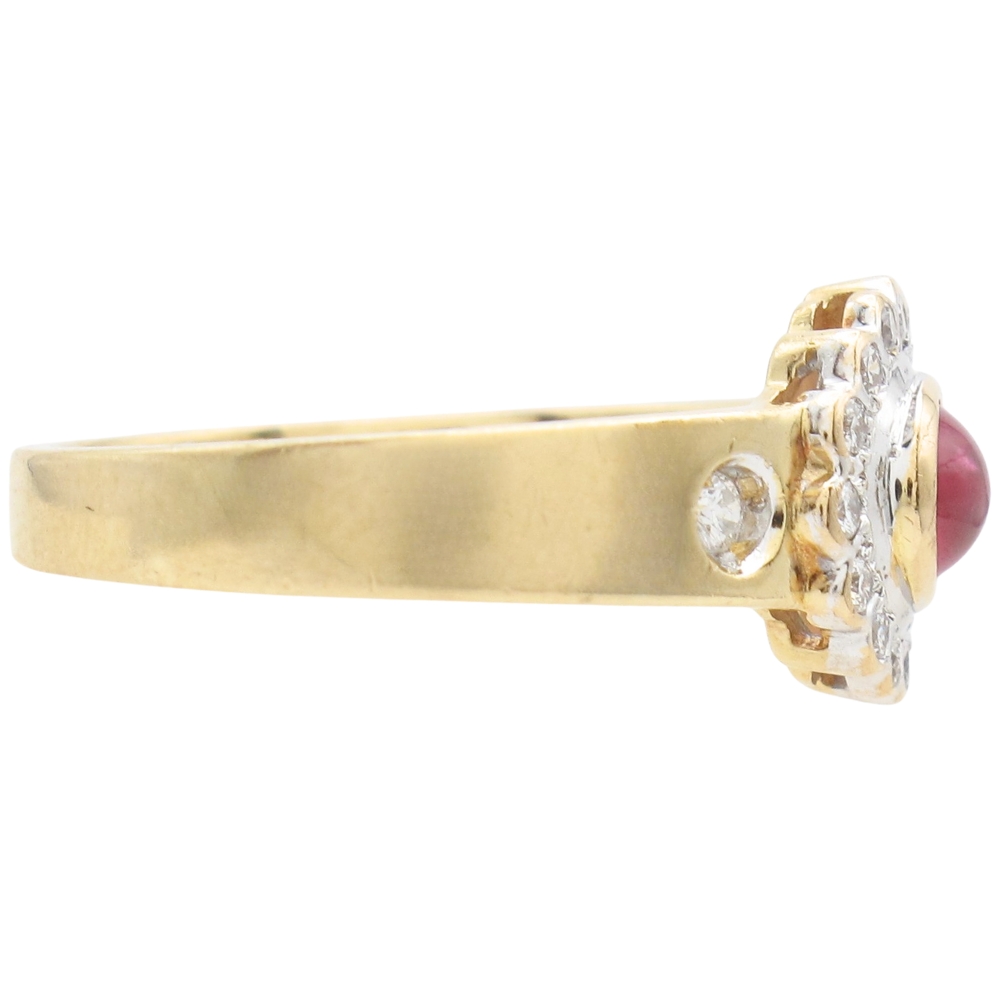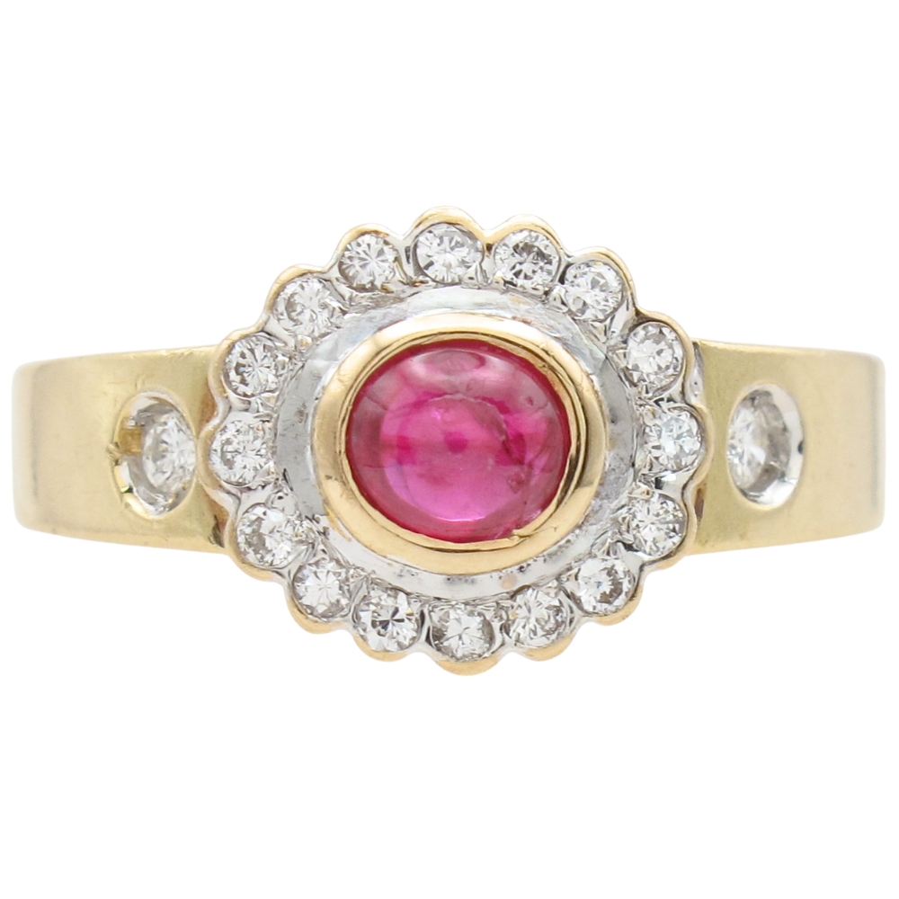 This captivating vintage ring is beautifully crafted in fine 14K gold and showcases a rich natural ruby cabochon at its center, celebrated for its deep color and luminous glow. The ruby is framed by a scalloped halo set with sixteen round brilliant diamonds, creating striking contrast and timeless elegance. A wide yellow gold shank adds substance and comfort, accented with two additional burnish-set diamonds for subtle sparkle and refined detail. With a total gem weight of 0.67 carat, this distinctive vintage ruby and diamond ring offers bold character and classic appeal, making it a standout choice for collectors and lovers of fine estate jewelry alike.