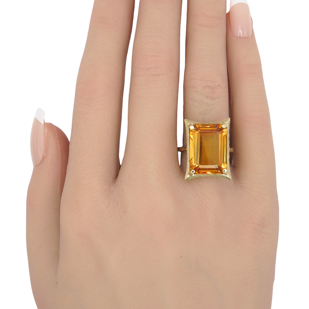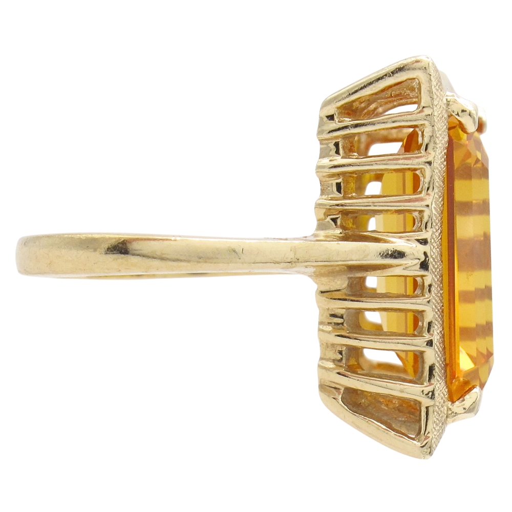 This striking vintage fashion ring is expertly crafted in fine 10K yellow gold, showcasing an impressive 15.4-carat lab-grown Yellow Sapphire. The radiant gemstone glows with golden sunshine hues, beautifully reflecting light from every angle through its emerald-cut facets. Its bold rectangular shape is framed by a distinctive pointed setting that adds a touch of geometric flair and sophistication. A true statement piece, this solitaire ring captures the glamour of vintage design while offering timeless elegance. Perfect for collectors or anyone seeking a vibrant pop of color in their fine jewelry collection, this piece is both eye-catching and exquisitely refined.
