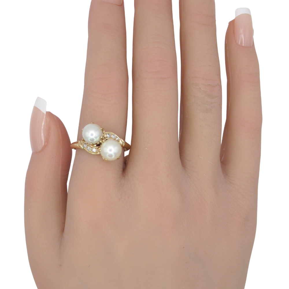 This vintage ring, crafted in fine 14K yellow gold, features an elegant bypass design that gracefully wraps around the finger, showcasing two lustrous cultured pearls as its focal point. The pearls’ soft glow is beautifully enhanced by six sparkling round cut Diamonds, adding subtle brilliance and refined sophistication. Timeless and feminine, this piece offers both vintage charm and modern wearability, making it an ideal choice for collectors, pearl lovers, or anyone seeking a unique high-end statement ring with classic elegance.
