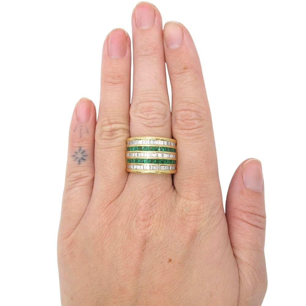 This luxurious estate ring is crafted in 18K gold and showcases a bold wide-band design set with five elegant rows of gemstones, featuring sixty-nine sparkling diamonds totaling approximately 2.50 carats and twenty-six vivid emeralds totaling approximately 2.08 carats, for an impressive combined gem weight of 4.58 carats. A striking statement piece with timeless character, this estate diamond and emerald ring embodies refined craftsmanship and enduring sophistication, making it an exceptional addition to any fine jewelry collection or a distinctive luxury gift. The ring is offered as pictured from a local estate, with complimentary professional cleaning or polishing to near new condition available upon request, simply note your preference in the comments at checkout. Perfect for collectors and lovers of bold and unique jewelry, this 18K gold baguette diamond and emerald ring offers rare elegance, bold presence, and enduring value.