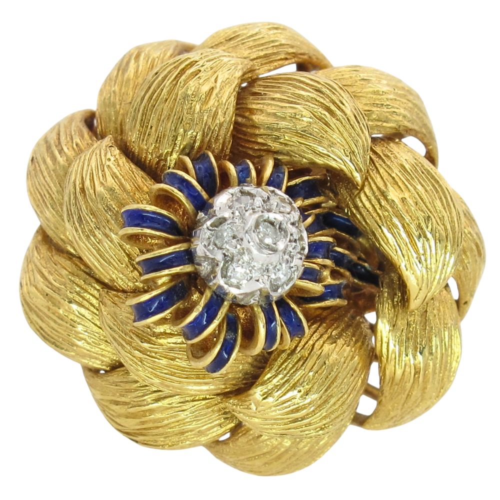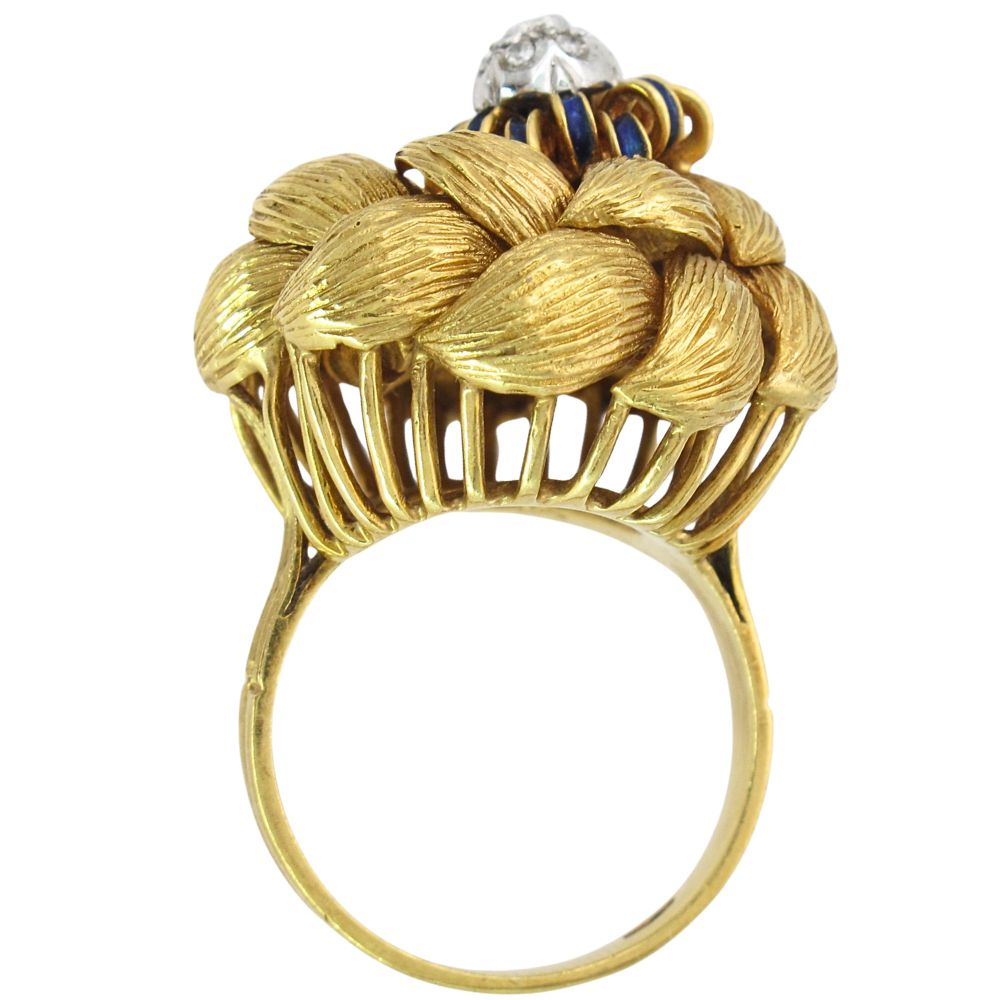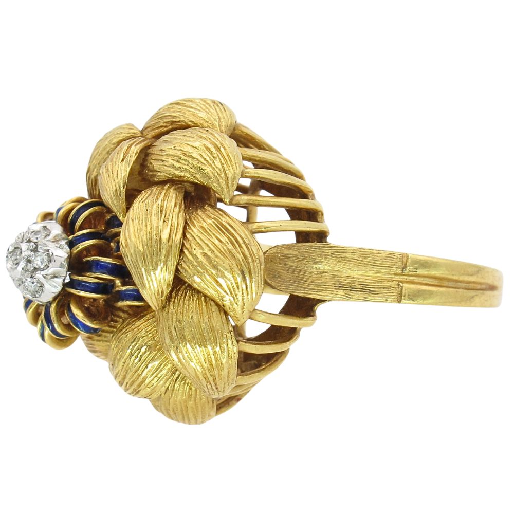 Sculptural and richly expressive, this vintage mid-century Bombe ring is a true work of wearable art, masterfully crafted in 18K yellow gold. A hand-made braided motif frames intricate blue enamel detailing, creating bold texture and depth, while a contrasting white gold diamond-accented element adds refined brilliance and visual intrigue. Playful and highly artistic, the heavily textured gold and vivid blue enameling evoke an imaginative spirit. With its dramatic dome silhouette and exceptional craftsmanship, this statement ring is a standout treasure and a distinctive addition to any discerning jewelry collection.