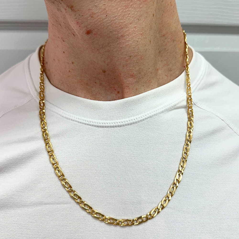 This impressive vintage men’s necklace is crafted in luxurious solid 18K gold and features distinctive tiger’s eye–inspired links that give a bold, textured look to a classic gold chain design. Measuring 23.5 inches in length and weighing a substantial 34.0 grams, this piece has a confident presence while remaining refined and wearable. Finished with a decorative lobster clasp for secure and easy wear, this unique gold necklace blends timeless style with an eye-catching twist, making it perfect for collectors, statement jewelry enthusiasts, or anyone seeking a standout men’s gold chain with character and craftsmanship.