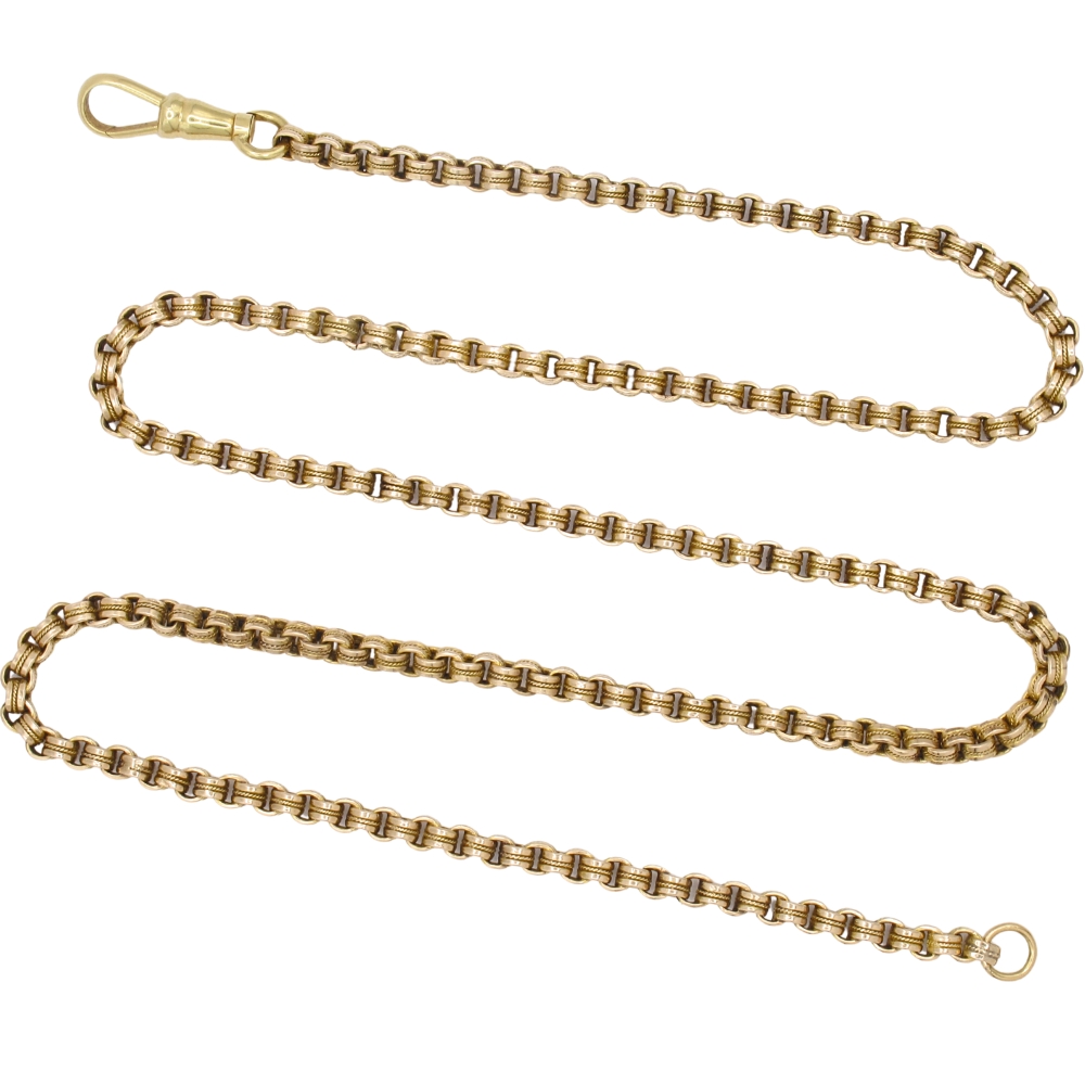 This elegant Victorian era chain necklace is handcrafted in fine 15K yellow gold and features classic round links accented with intricate cable twist detailing, a hallmark of 19th-century craftsmanship. Measuring 22 inches in length and weighing a substantial 19.7 grams, the chain offers a beautiful balance of presence and wearability. It is finished with a traditional 18K gold lanyard, or dog clip, and jump ring closure, adding both authenticity and functional charm. Rich in history and timeless appeal, this antique gold necklace is perfect worn on its own, layered with other chains, or used to display a favorite pendant, making it a versatile and collectible addition to any fine jewelry collection.