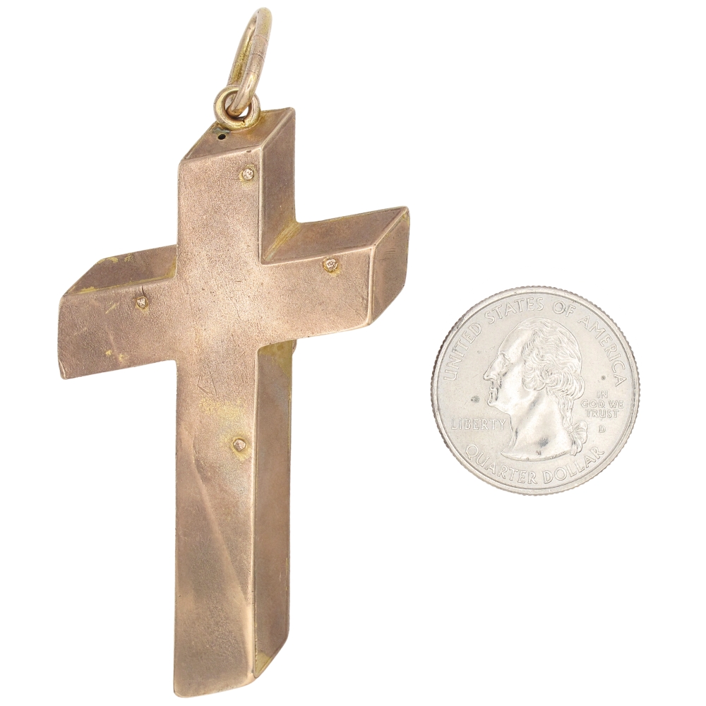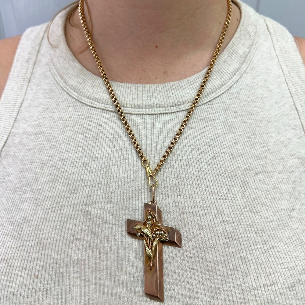 This striking Victorian era cross pendant is handcrafted in warm 10K rose gold and features a bold, large-scale three-dimensional design that feels both architectural and romantic. Accented with exquisitely detailed lily of the valley flowers rendered in contrasting yellow gold, this antique pendant showcases exceptional realism and masterful craftsmanship rarely seen today. A generously sized attached bale allows it to be worn on nearly any necklace, making it as versatile as it is eye-catching. Rich in symbolism, lily of the valley represented a “return to happiness” during the Victorian period, adding meaningful sentiment to this remarkable antique cross pendant—an heirloom-quality piece perfect for collectors and lovers of historic fine jewelry. *chain not included