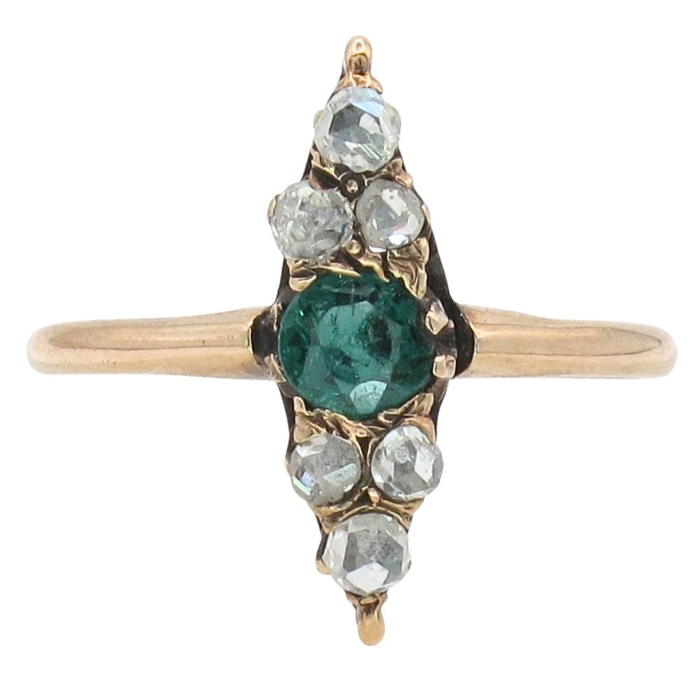 This exquisite Victorian era navette gemstone ring is handcrafted in 10K rose gold and features the iconic elongated navette silhouette, a signature style of the Victorian period prized for its elegant, feminine profile. At the center is a round faceted green tourmaline weighing approximately 0.40 carat, beautifully accented by six sparkling rose cut diamonds. Offered as pictured from a local estate, worn prongs will be professionally repaired to ensure long-lasting wear, and complimentary cleaning or polishing to a near-new finish is available. A rare and collectible piece of antique jewelry, this Victorian tourmaline and rose cut diamond ring is perfect for collectors, vintage jewelry lovers, or anyone seeking a unique ring with historical charm, refined craftsmanship, and enduring elegance.