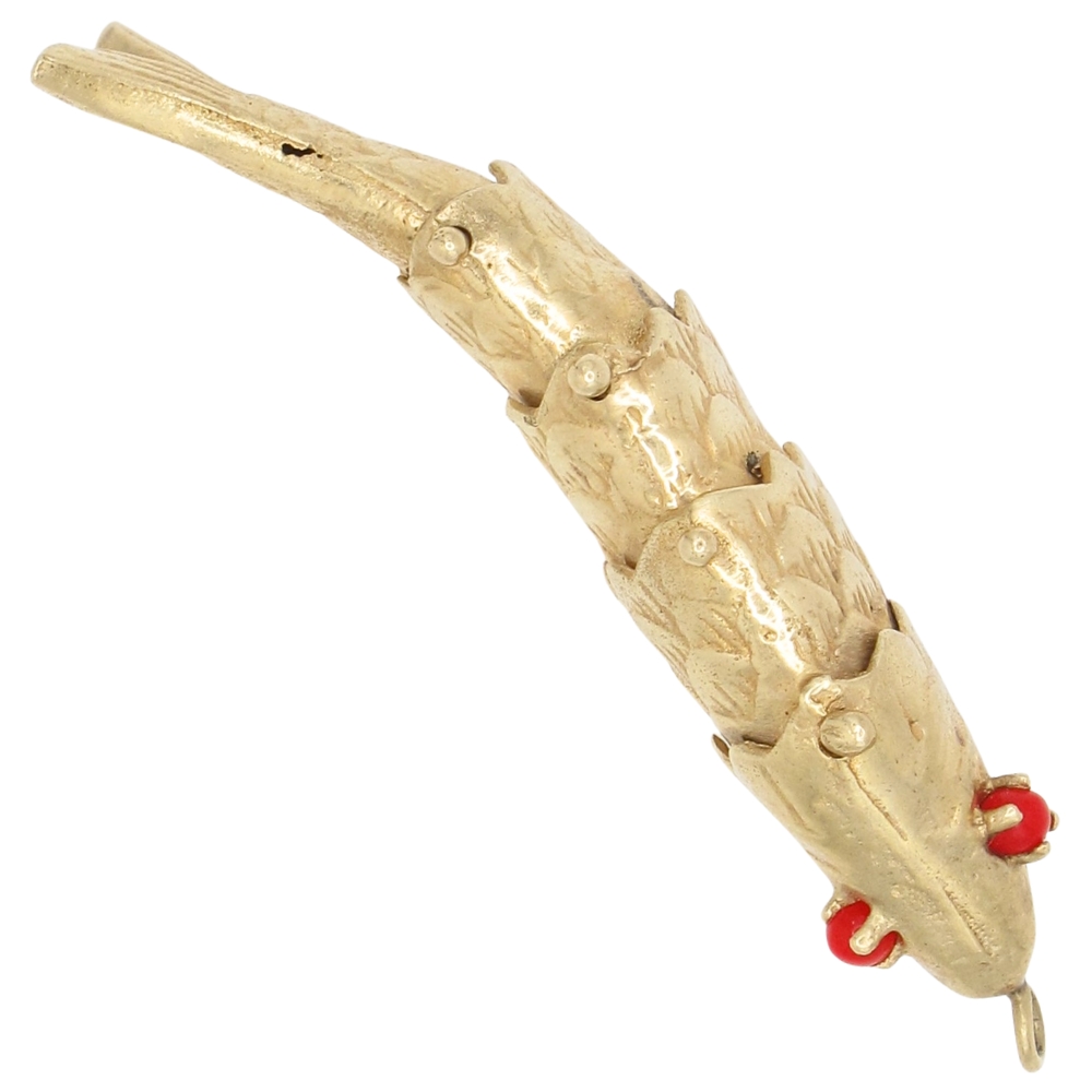 This charming vintage pendant charm is handcrafted in fine 14K yellow gold and depicts a delightful articulated fish in a fully three-dimensional design, complete with moving sections that bring the piece to life. The fish is accented with faux red coral inset eyes, adding a playful pop of color and vintage character. Showing minor wear consistent with age, this piece retains its authentic patina and collectible appeal. Currently without a jump ring or bail, it offers wonderful versatility for customization—perfect for adding to a charm bracelet or converting into a unique pendant. A whimsical and well-crafted gold charm, this piece is ideal for vintage jewelry lovers, nautical enthusiasts, or anyone seeking a distinctive and conversation-starting treasure.