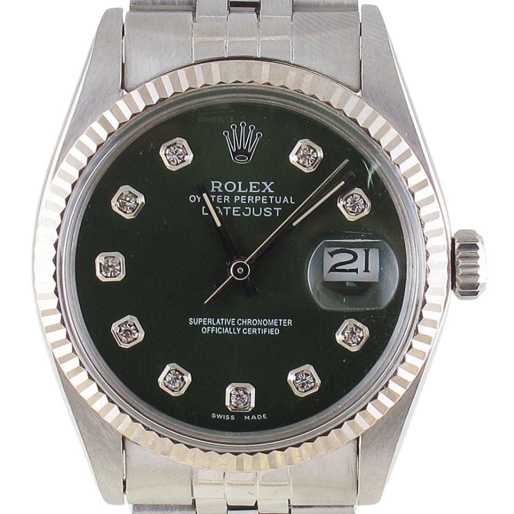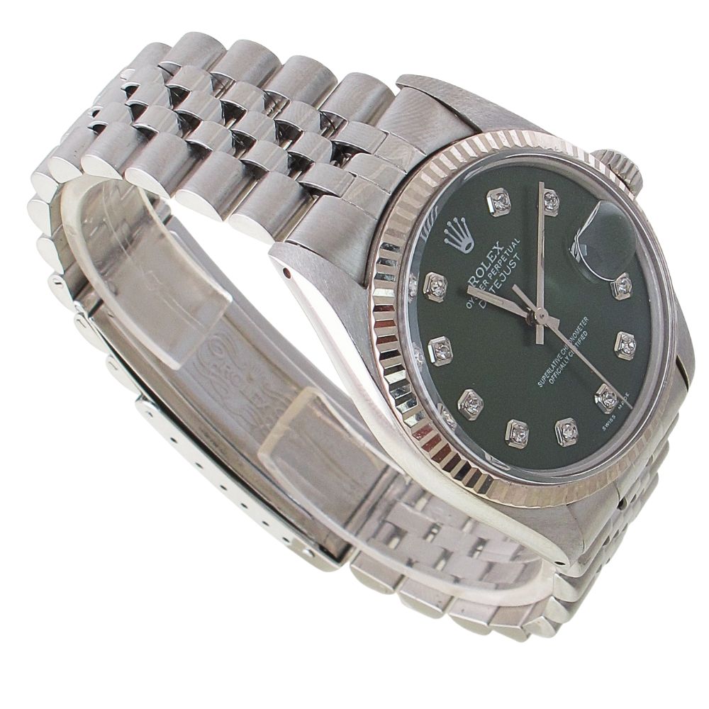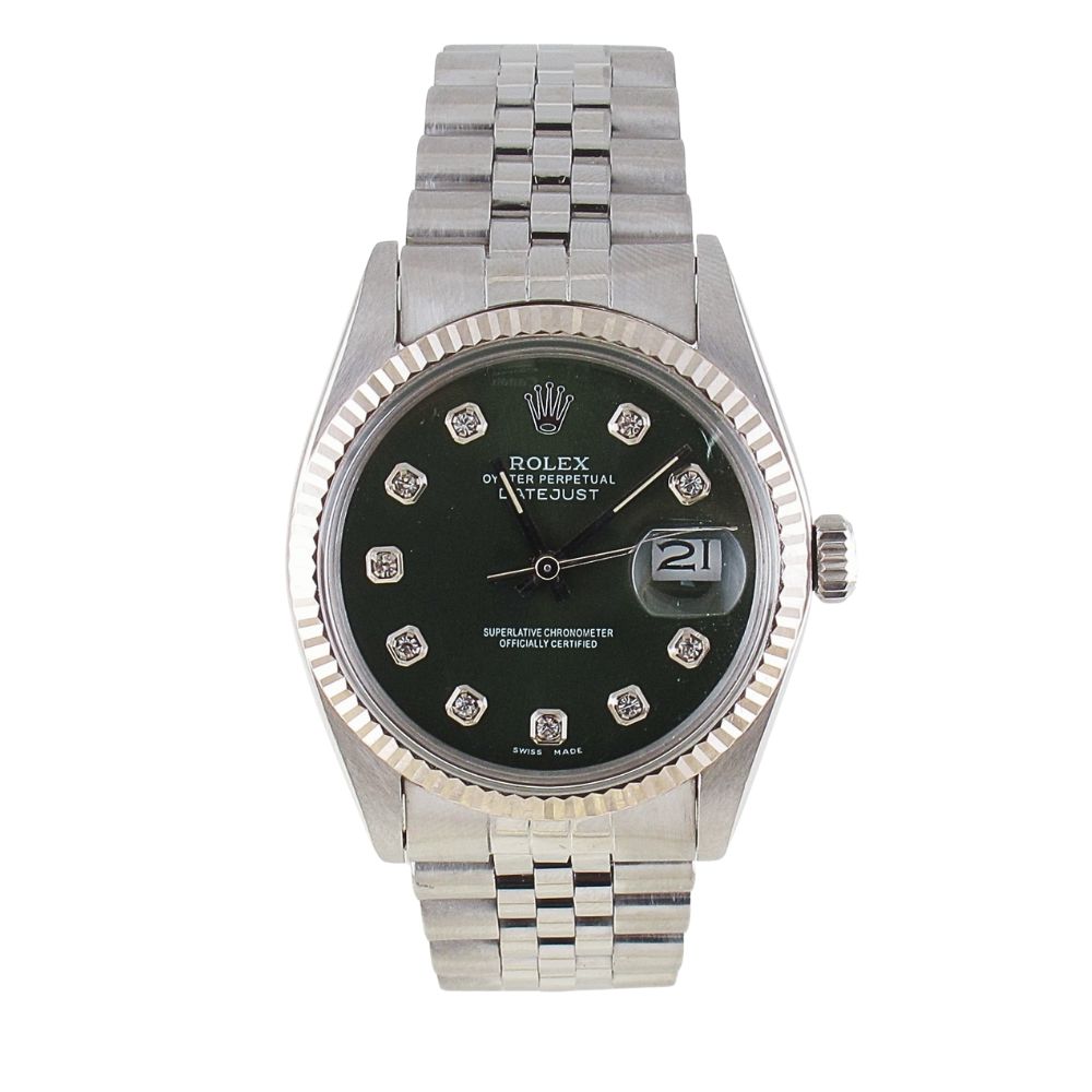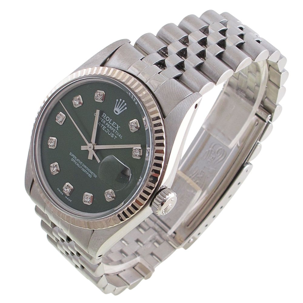 Pre-Owned Rolex Datejust (1979) Stainless Steel 16014. This is a pre-owned Rolex 36MM Stainless Steel Datejust Green Diamond Dial (Custom) with jubilee band. All Rolex watches sold by Arnold Jewelers have been fully serviced including factory finish. We offer a 1-year warranty on this watch and guarantee it with our own official certification. We sell only the finest pre-owned Rolex’s and this watch is no exception, it is in like-new condition.