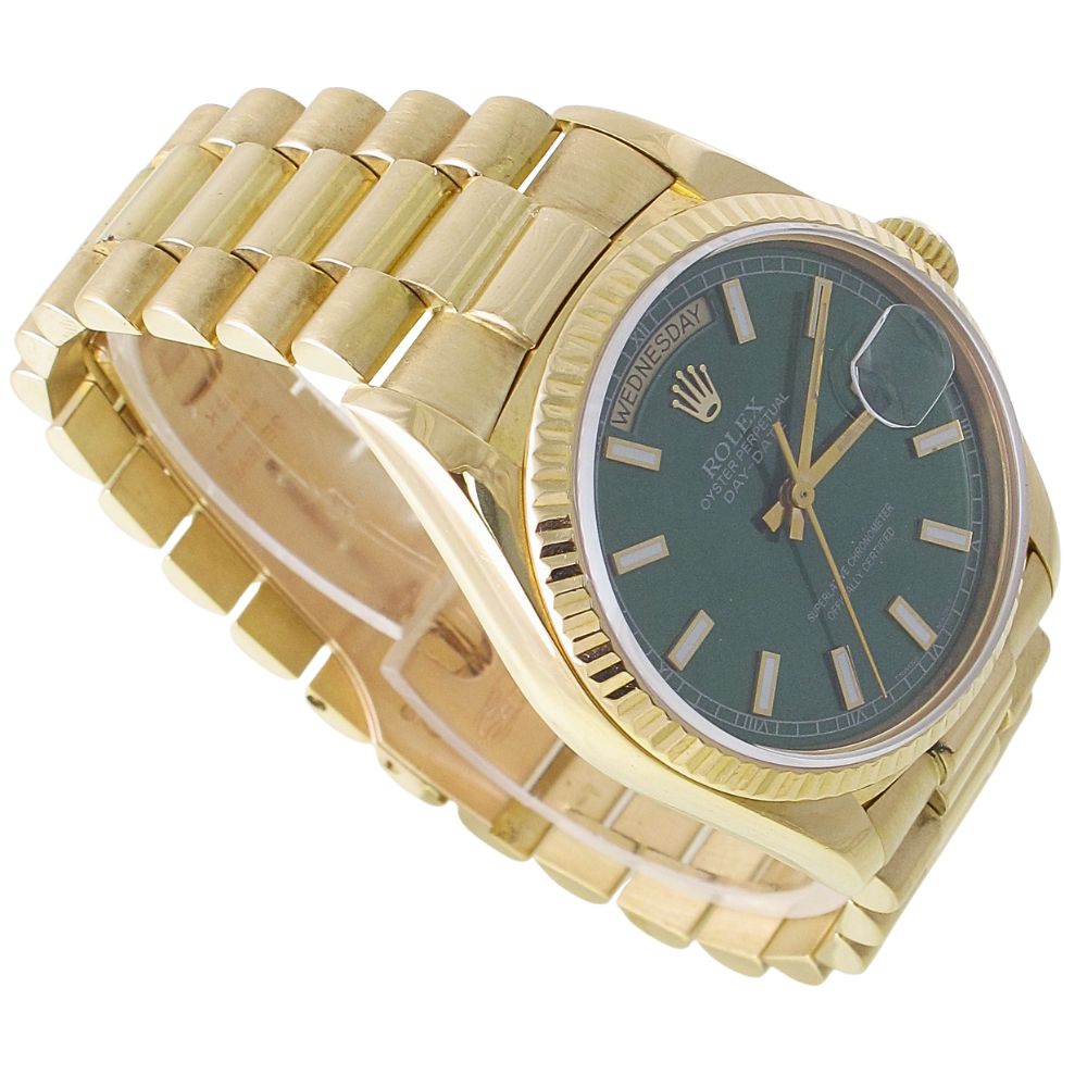 Pre-owned Rolex Day-Date Presidential (1987) 18038 (Presidential Single Quick Set) 18k Yellow Gold With Custom Green Stick Dial With Model 18038
