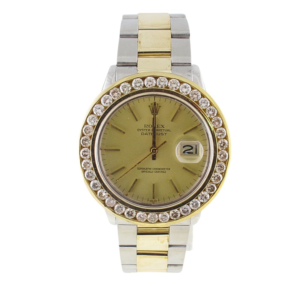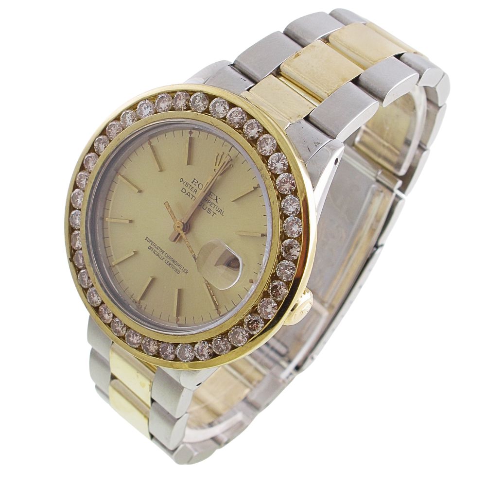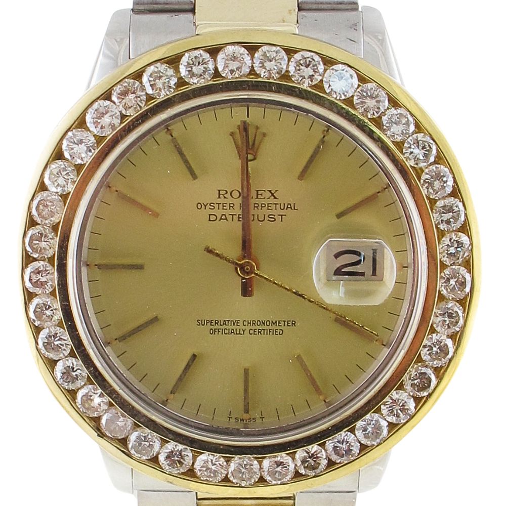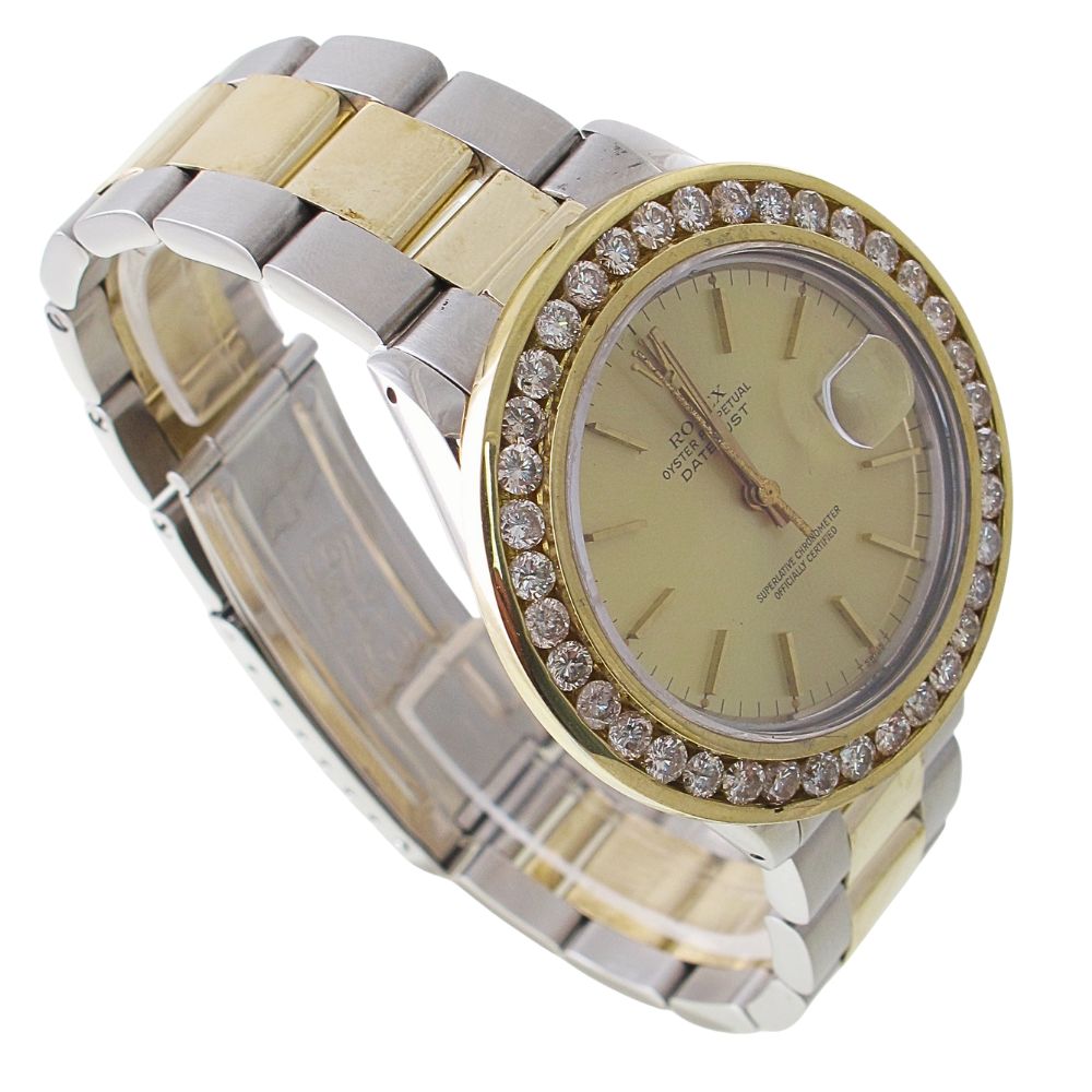 Pre-Owned 1980 Two Tone Rolex Datejust 36MM Watch Champagne Stick Dial With Custom Gold Plated Diamond Bezel Custom Oyster Style Band Model# 16013