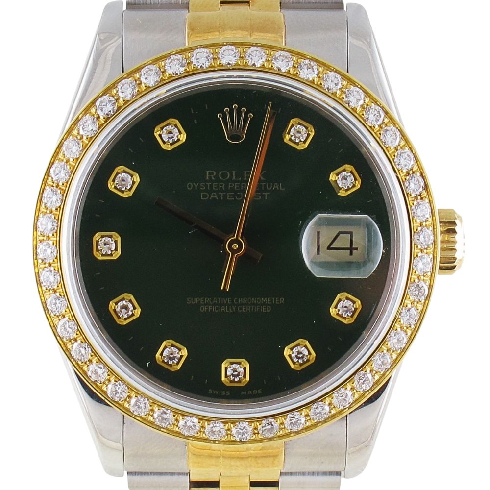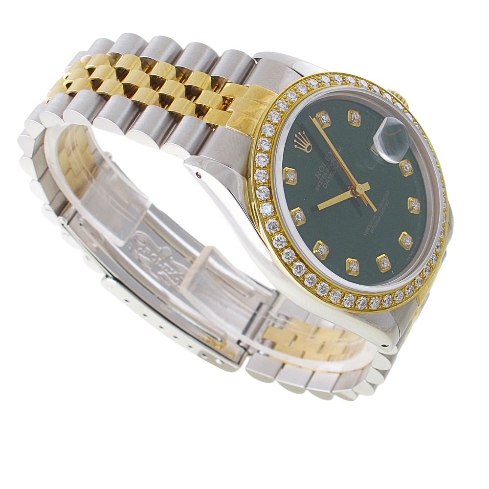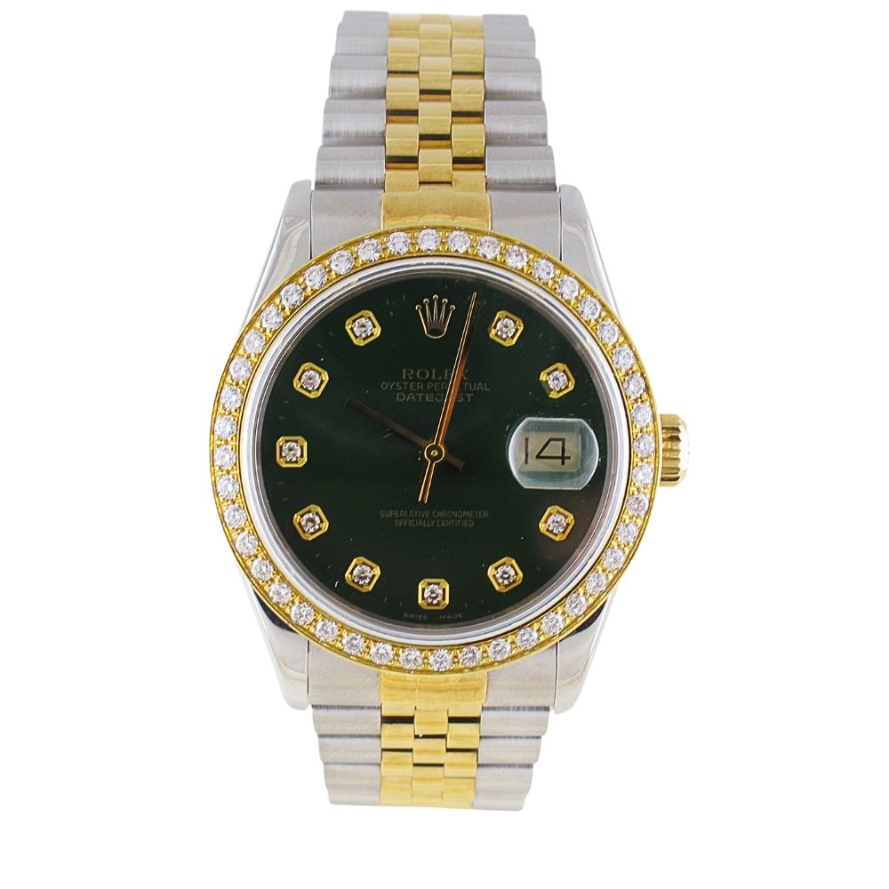 Pre-Owned 1986 Two Tone Rolex Datejust 36MM Watch Green Diamond Dial With Diamond Bezel Jubilee Band Model# 16013