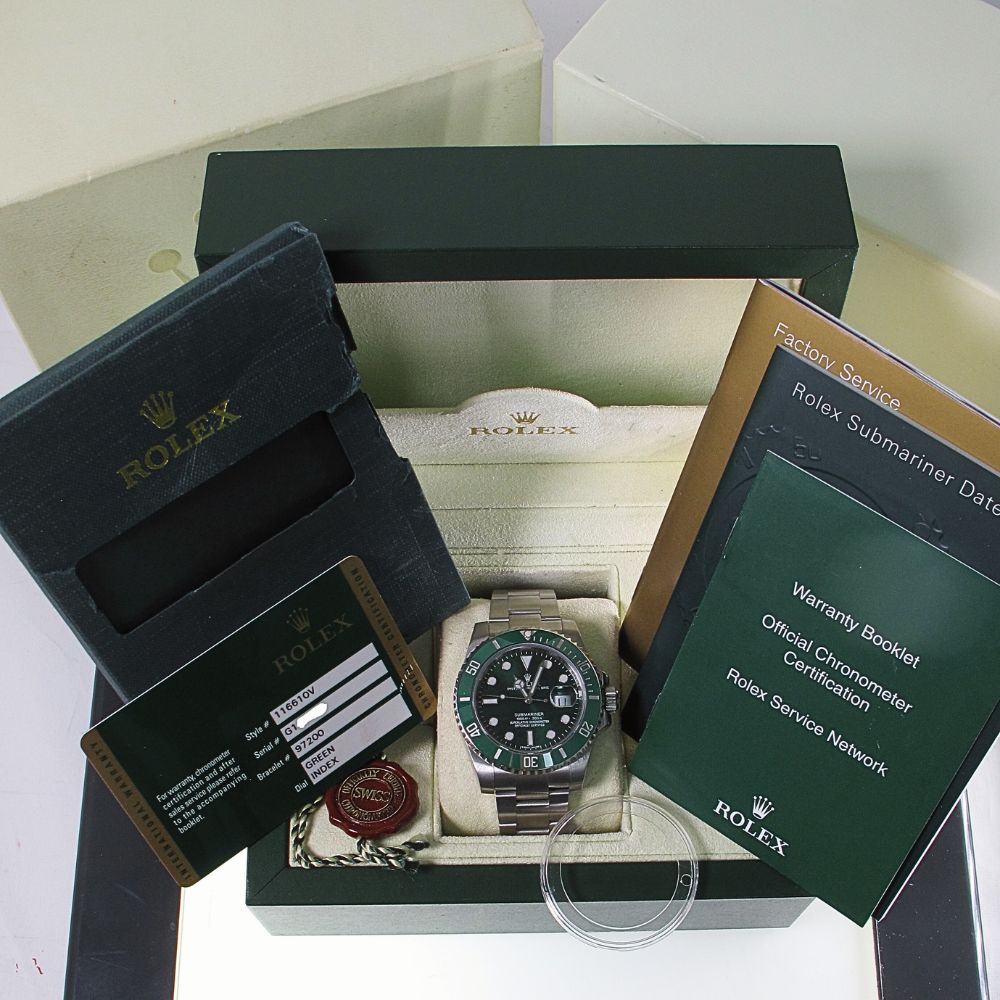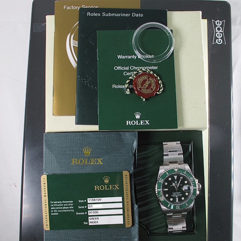 Pre-Owned 2011 40MM Rolex Submariner Model 116610LV. This is a Pre-Owned Rolex Stainless Steel 40MM Submariner Watch With Green Dial, Green Ceramic Bezel (The Hulk). Has Oyster band Comes with original Rolex Certificate of Authenticity, Original Rolex box, and booklets, Hang Tag, Bezel Protector. All Rolex watches sold by Arnold Jewelers have been fully serviced including factory finish. We offer a 2-year warranty on this watch, and guarantee it with our own official certification. We sell only the finest pre-owned Rolex’s and this watch is no exception, it is in very good condition.
