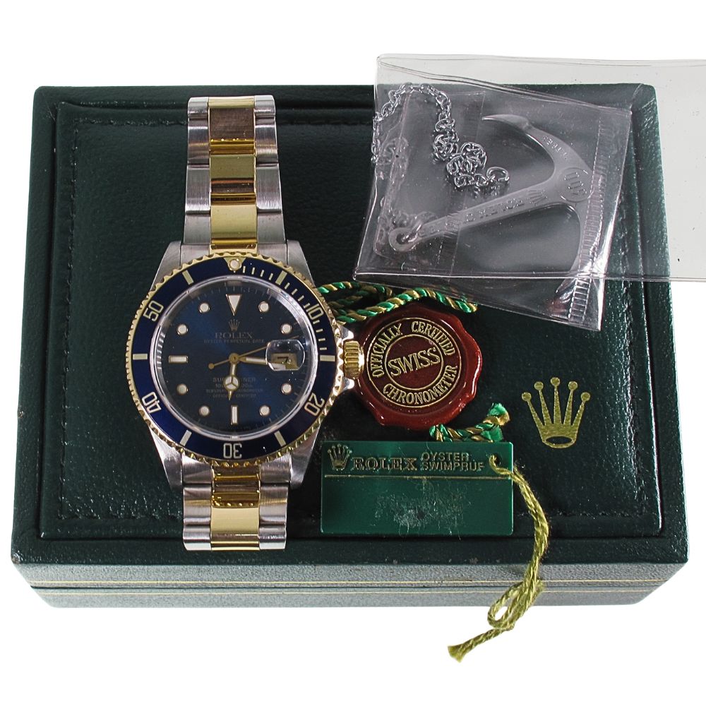 1993 Rolex Two Tone Submariner Model 16613 This is a pre-owned Submariner 40MM with Blue Bezel and Blue Index Dial with an oyster bracelet. Comes with Rolex Box, Tags, And Anchor. All Rolex watches sold by Arnold Jewelers have been fully serviced including factory finish. We offer a 1-year warranty on our watches and guarantee them with our own official certification. We sell only the finest pre-owned Rolex’s and this watch is no exception, it is in like-new condition
