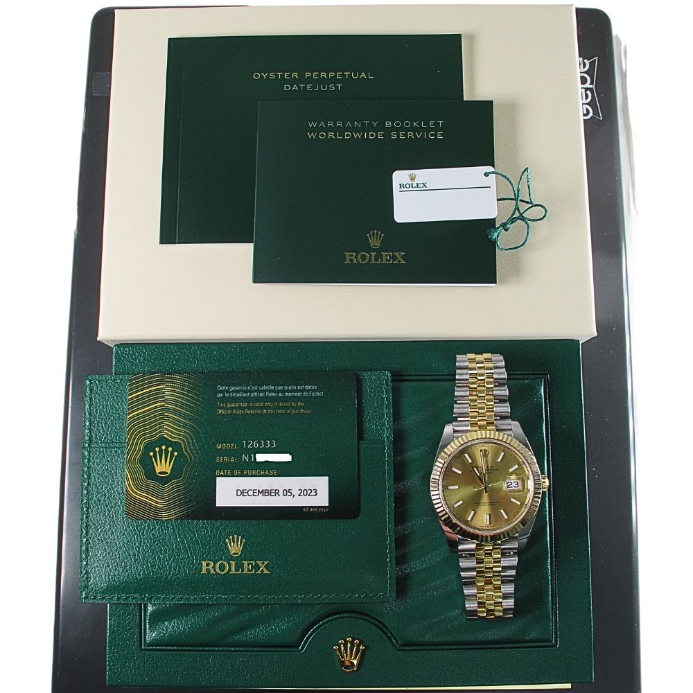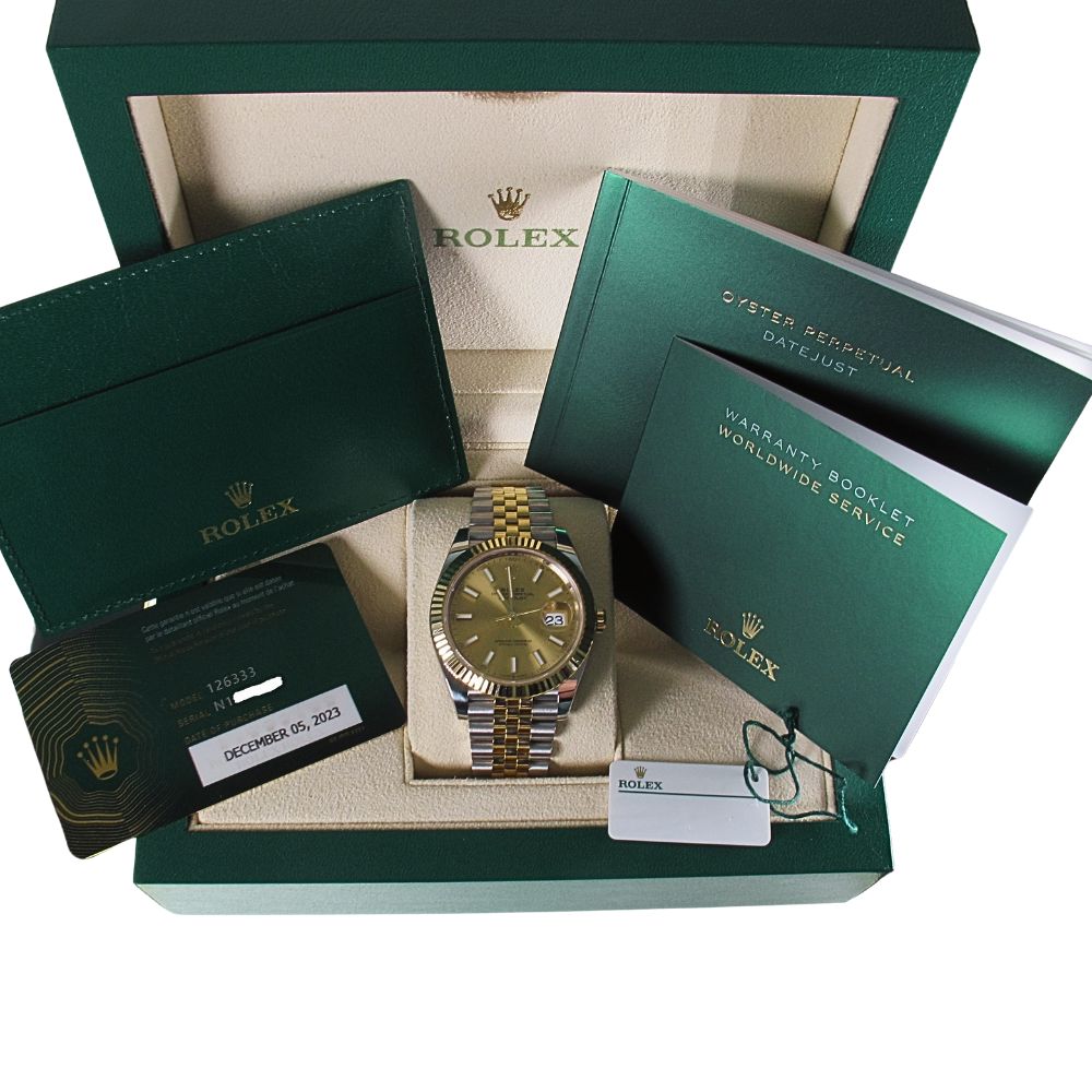 2023 Two Tone Rolex Datejust 41MM Watch With Champagne Dial Model 126333. This is a Pre-Owned Rolex Two Tone Datejust With Champagne Dial With Yellow Gold Fluted Bezel and Jubilee band. Comes With Original Rolex Certificate Of Authenticity Card, Original Rolex Box, Booklets, And Tag. All Rolex watches sold by Arnold Jewelers have been fully serviced including factory finish. We offer a 2-year warranty on this watch and guarantee it with our own official certification. We sell only the finest pre-owned Rolex’s and this watch is no exception, it is in very good condition.