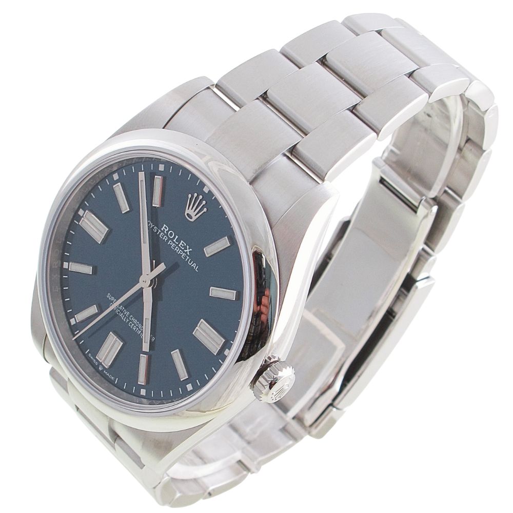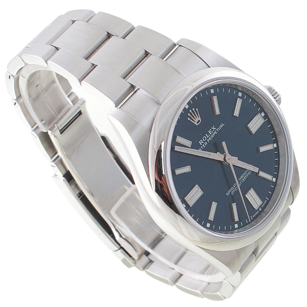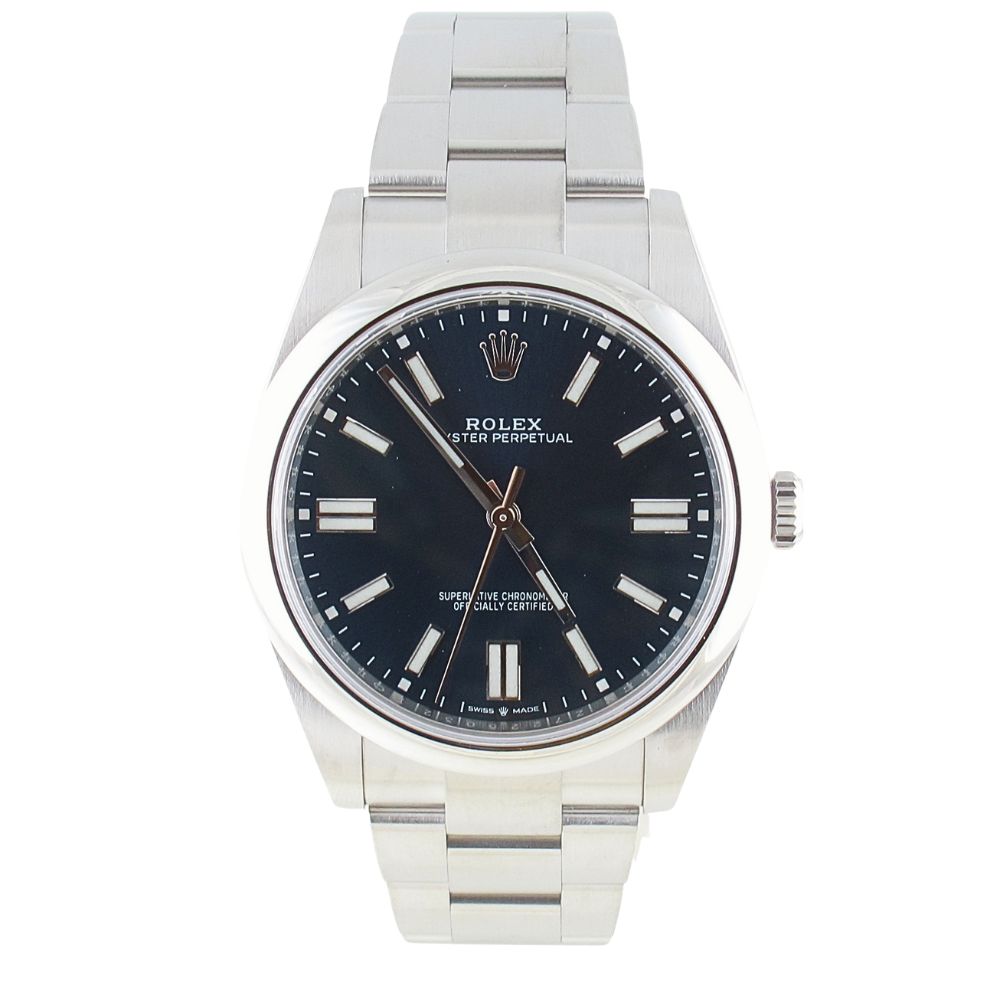 Pre-Owned 2023 Stainless Steel Rolex Oyster Perpetual 41MM Watch With Black Stick Dial Model 114300. This is a Pre-Owned Rolex Stainless Steel Oyster Perpetual With Blue Stick Dial and Oyster band. Comes With Original Rolex Certificate Of Authenticity, Original Rolex Box, and Booklets. All Rolex watches sold by Arnold Jewelers have been fully serviced including factory finish. We offer a 2-year warranty on this watch and guarantee it with our own official certification. We sell only the finest pre-owned Rolex’s and this watch is no exception, it is in very good condition.