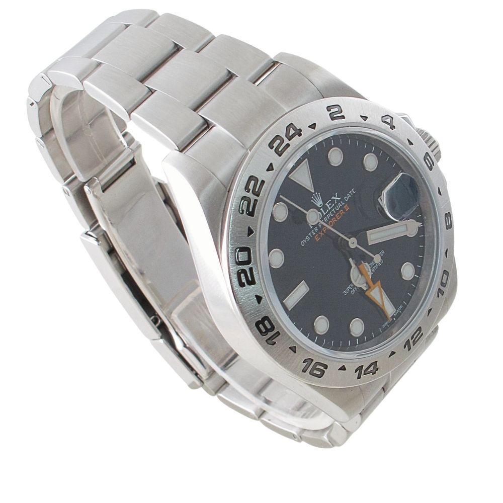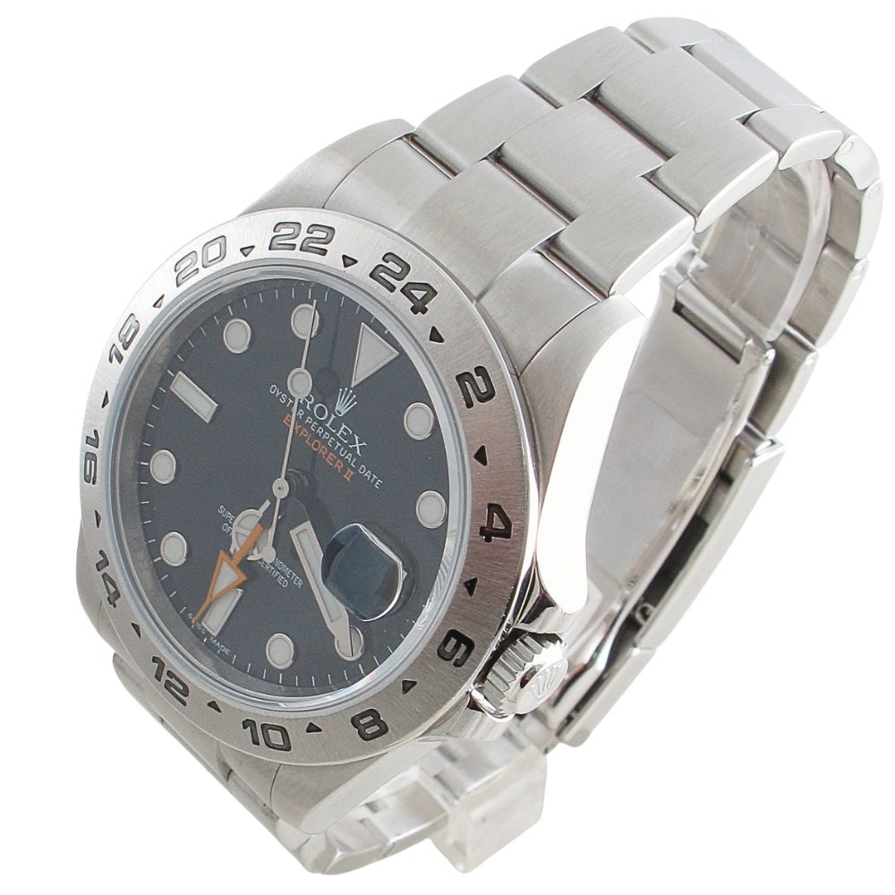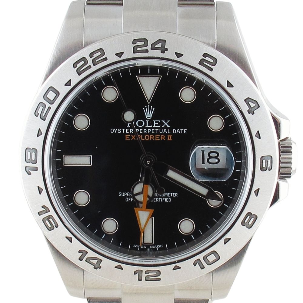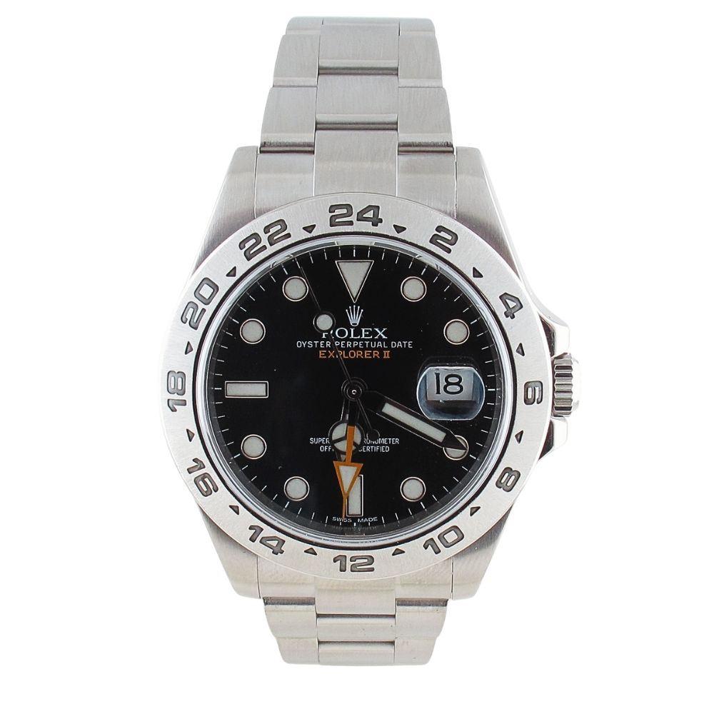 Pre-Owned Rolex (Certified 2025)Stainless Steel Explorer II 42MMWatch. This is a Pre-Owned Rolex. Gents Stainless Steel Explorer II with 24 Hour bezel and Black index Dial with Orange GMT Hand, and oyster band. Comes with original Rolex 2025 Certificate Pre-Owned Authenticity Card, Rolex Box and Certified booklet, and hang tag.The watchband has all original factory links. All Rolex watches sold by Arnold Jewelers have been fully serviced including factory finish. We offer a 2-year full-service warranty on our watches and guarantee them w/ our own official certification. We sell only the finest pre-owned Rolex’s and this watch is no exception, it is in good condition.