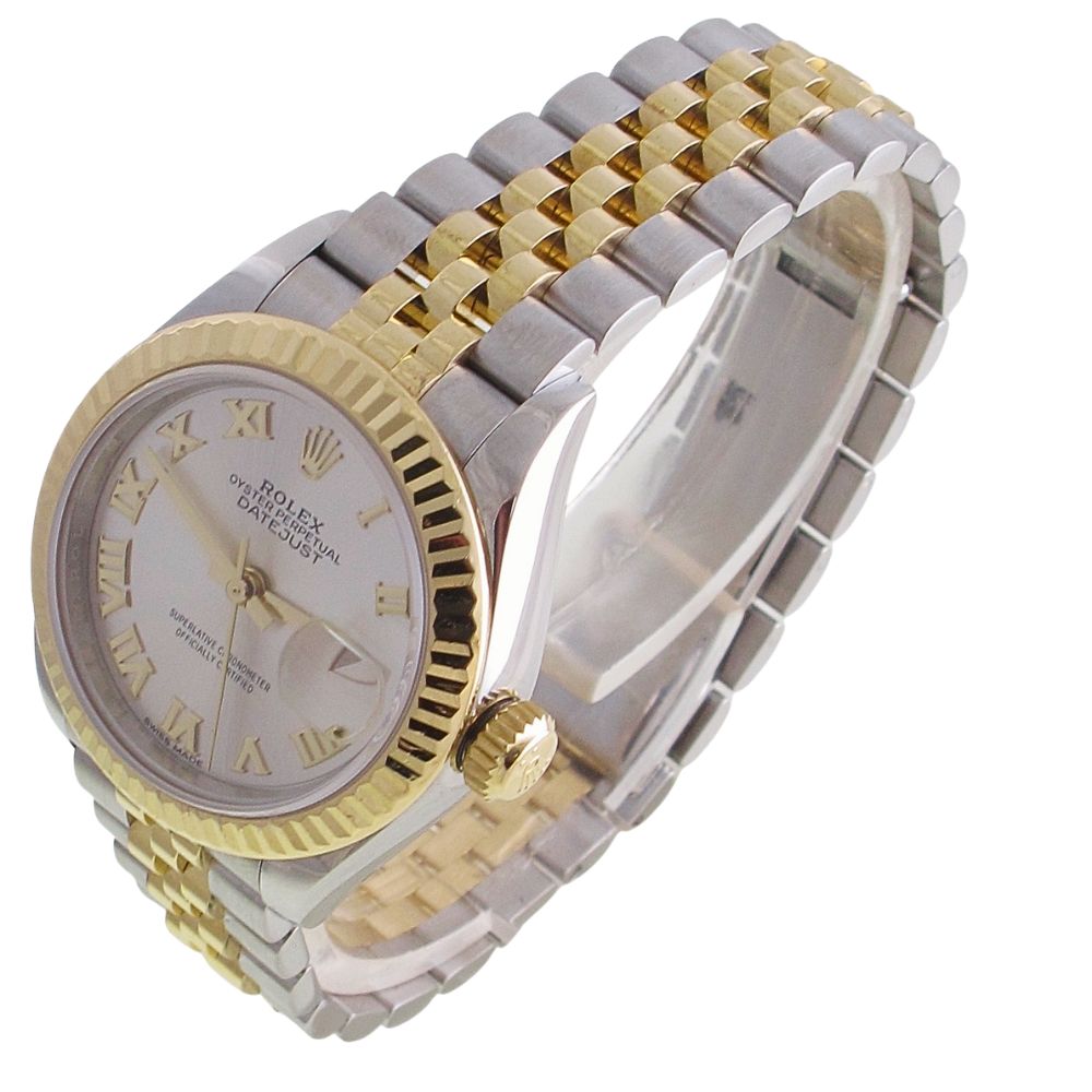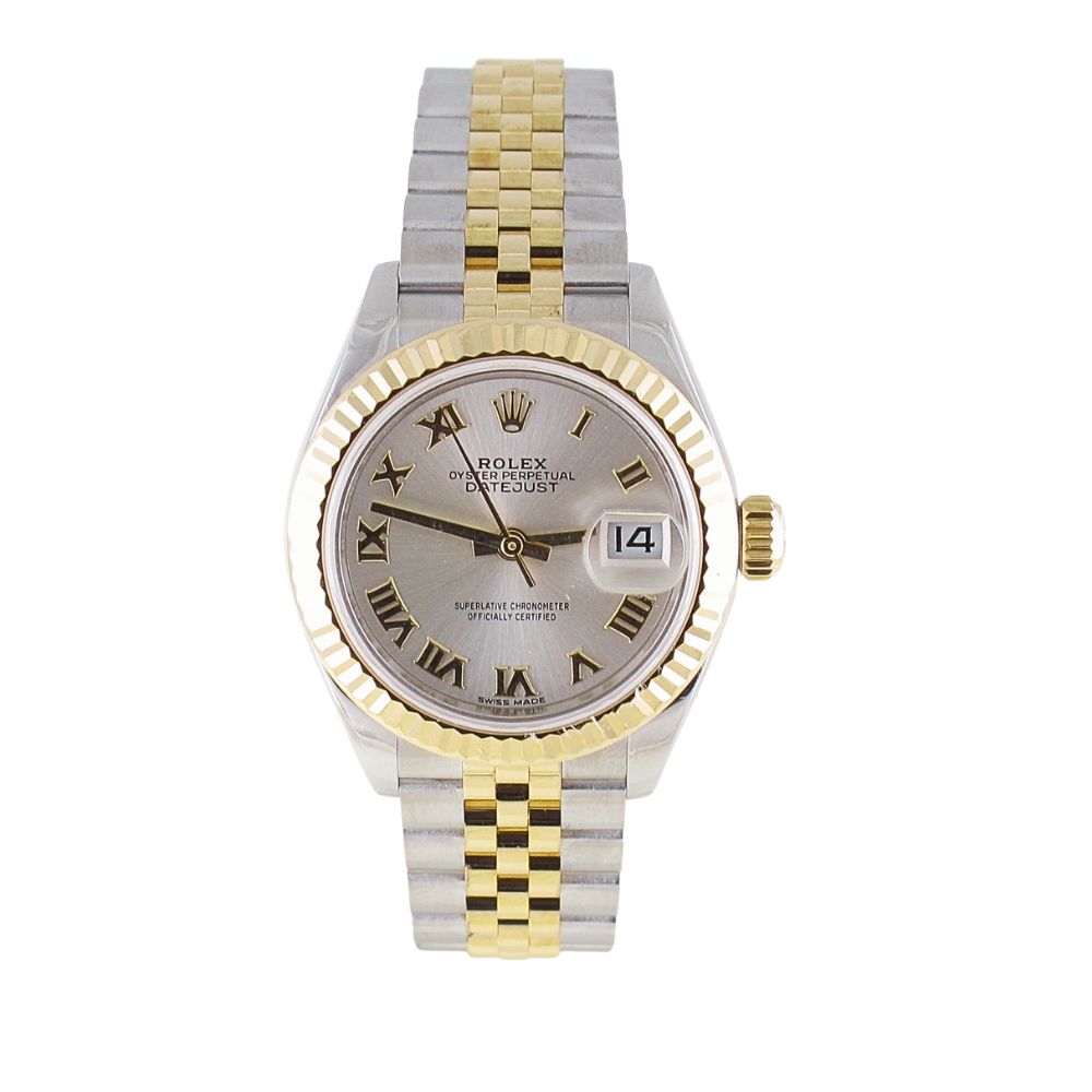 This is a Pre-Owned Rolex 28MM Ladies Two Tone Datejust Watch with Grey Roman Dial and fluted bezel, Two Tone Jubilee Band With Hidden Clasp. We offer a 2-year full-service warranty on our watches and guarantee them w/ our own official certification. We sell only the finest pre-owned Rolex’s and this watch is no exception, it is in Excellent condition.